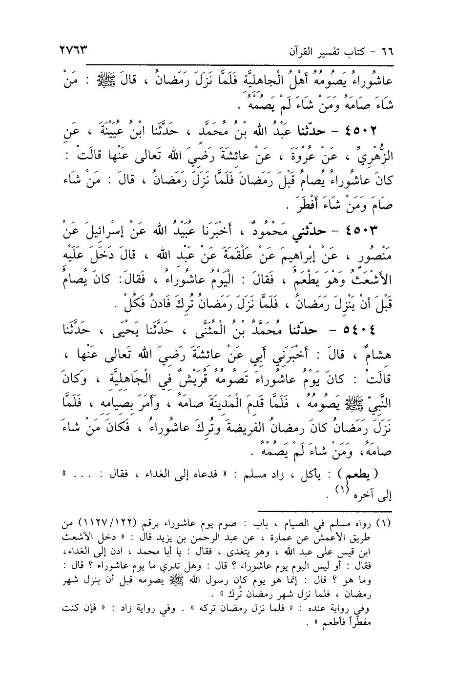4504 - حَدَّثَنِي مُحَمَّدُ بْنُ المُثَنَّى، حَدَّثَنَا يَحْيَى، حَدَّثَنَا هِشَامٌ، قَالَ: أَخْبَرَنِي أَبِي، عَنْ عَائِشَةَ رَضِيَ اللَّهُ عَنْهَا، قَالَتْ: «كَانَ يَوْمُ عَاشُورَاءَ تَصُومُهُ قُرَيْشٌ فِي الجَاهِلِيَّةِ، وَكَانَ النَّبِيُّ صَلَّى اللهُ عَلَيْهِ وَسَلَّمَ يَصُومُهُ فَلَمَّا قَدِمَ المَدِينَةَ صَامَهُ وَأَمَرَ بِصِيَامِهِ، فَلَمَّا نَزَلَ رَمَضَانُ كَانَ رَمَضَانُ الفَرِيضَةَ، وَتُرِكَ عَاشُورَاءُ، فَكَانَ مَنْ شَاءَ صَامَهُ وَمَنْ شَاءَ لَمْ يَصُمْهُ».