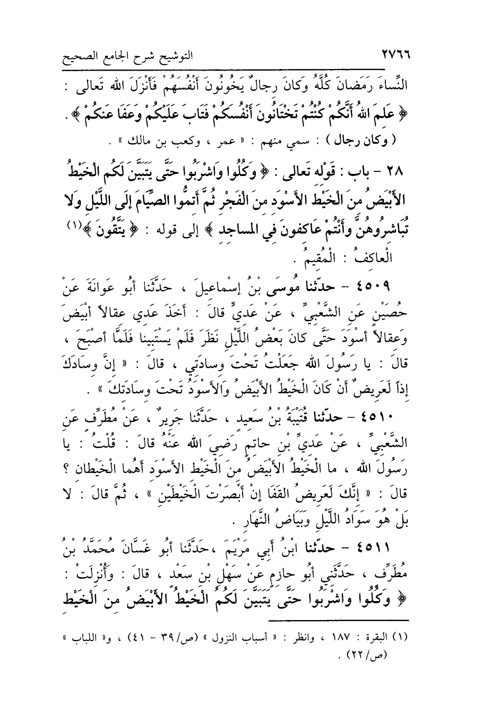 4510 - حَدَّثَنَا قُتَيْبَةُ بْنُ سَعِيدٍ، حَدَّثَنَا جَرِيرٌ، عَنْ مُطَرِّفٍ، عَنِ الشَّعْبِيِّ، عَنْ عَدِيِّ بْنِ حَاتِمٍ رَضِيَ اللَّهُ عَنْهُ، قَالَ: قُلْتُ يَا رَسُولَ اللَّهِ: مَا الخَيْطُ الأَبْيَضُ، مِنَ الخَيْطِ الأَسْوَدِ أَهُمَا الخَيْطَانِ، قَالَ: «إِنَّكَ لَعَرِيضُ القَفَا، إِنْ أَبْصَرْتَ الخَيْطَيْنِ»، ثُمَّ قَالَ: «لاَ بَلْ هُوَ سَوَادُ اللَّيْلِ، وَبَيَاضُ النَّهَارِ».