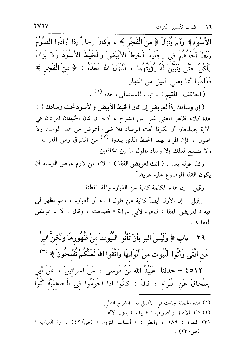 الأَسْوَدِ} [البقرة: 187] وَلَمْ يُنْزَلْ: {مِنَ الفَجْرِ} [البقرة: 187] " وَكَانَ رِجَالٌ إِذَا أَرَادُوا الصَّوْمَ رَبَطَ أَحَدُهُمْ فِي رِجْلَيْهِ الخَيْطَ الأَبْيَضَ وَالخَيْطَ الأَسْوَدَ، وَلاَ يَزَالُ يَأْكُلُ حَتَّى يَتَبَيَّنَ لَهُ رُؤْيَتُهُمَا، فَأَنْزَلَ اللَّهُ بَعْدَهُ: {مِنَ الفَجْرِ} [البقرة: 187] «فَعَلِمُوا أَنَّمَا يَعْنِي اللَّيْلَ مِنَ النَّهَارِ».
