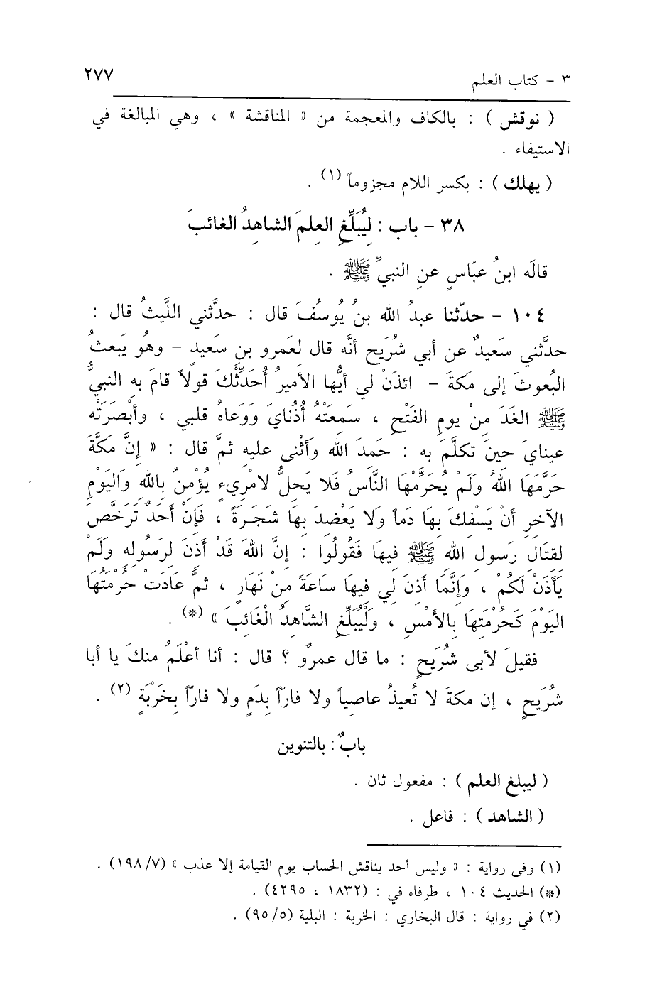 104 - حَدَّثَنَا عَبْدُ اللَّهِ بْنُ يُوسُفَ، قَالَ: حَدَّثَنِي اللَّيْثُ، قَالَ: حَدَّثَنِي سَعِيدٌ هُوَ ابْنُ أَبِي سَعِيدٍ، عَنْ أَبِي شُرَيْحٍ، أَنَّهُ قَالَ لِعَمْرِو بْنِ سَعِيدٍ: - وَهُوَ يَبْعَثُ البُعُوثَ إِلَى مَكَّةَ - ائْذَنْ لِي أَيُّهَا الأَمِيرُ، أُحَدِّثْكَ قَوْلًا قَامَ بِهِ النَّبِيُّ صَلَّى اللهُ عَلَيْهِ وَسَلَّمَ الغَدَ مِنْ يَوْمِ الفَتْحِ، سَمِعَتْهُ أُذُنَايَ وَوَعَاهُ قَلْبِي، وَأَبْصَرَتْهُ عَيْنَايَ حِينَ تَكَلَّمَ بِهِ: حَمِدَ اللَّهَ وَأَثْنَى عَلَيْهِ، ثُمَّ قَالَ: " إِنَّ مَكَّةَ حَرَّمَهَا اللَّهُ، وَلَمْ يُحَرِّمْهَا النَّاسُ، فَلاَ يَحِلُّ لِامْرِئٍ يُؤْمِنُ بِاللَّهِ وَاليَوْمِ الآخِرِ أَنْ يَسْفِكَ بِهَا دَمًا، وَلاَ يَعْضِدَ بِهَا شَجَرَةً، فَإِنْ أَحَدٌ تَرَخَّصَ لِقِتَالِ رَسُولِ اللَّهِ صَلَّى اللهُ عَلَيْهِ وَسَلَّمَ فِيهَا، فَقُولُوا: إِنَّ اللَّهَ قَدْ أَذِنَ لِرَسُولِهِ وَلَمْ يَأْذَنْ لَكُمْ، وَإِنَّمَا أَذِنَ لِي فِيهَا سَاعَةً مِنْ نَهَارٍ، ثُمَّ عَادَتْ حُرْمَتُهَا اليَوْمَ كَحُرْمَتِهَا بِالأَمْسِ، وَلْيُبَلِّغِ الشَّاهِدُ الغَائِبَ " فَقِيلَ لِأَبِي شُرَيْحٍ مَا قَالَ عَمْرٌو قَالَ: أَنَا أَعْلَمُ مِنْكَ يَا أَبَا شُرَيْحٍ لاَ يُعِيذُ عَاصِيًا وَلاَ فَارًّا بِدَمٍ وَلاَ فَارًّا بِخَرْبَةٍ.