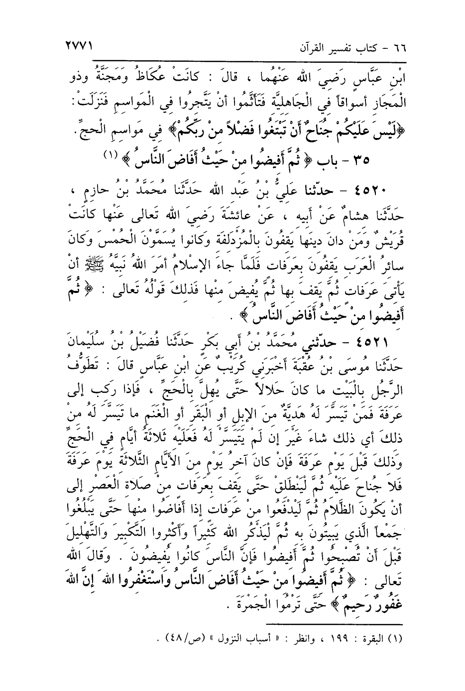 4520 - حَدَّثَنَا عَلِيُّ بْنُ عَبْدِ اللَّهِ، حَدَّثَنَا مُحَمَّدُ بْنُ خَازِمٍ، حَدَّثَنَا هِشَامٌ، عَنْ أَبِيهِ، عَنْ عَائِشَةَ رَضِيَ اللَّهُ عَنْهَا: «كَانَتْ قُرَيْشٌ وَمَنْ دَانَ دِينَهَا يَقِفُونَ بِالْمُزْدَلِفَةِ، وَكَانُوا يُسَمَّوْنَ الحُمْسَ، وَكَانَ سَائِرُ العَرَبِ يَقِفُونَ بِعَرَفَاتٍ، فَلَمَّا جَاءَ الإِسْلاَمُ أَمَرَ اللَّهُ نَبِيَّهُ صَلَّى اللهُ عَلَيْهِ وَسَلَّمَ أَنْ يَأْتِيَ عَرَفَاتٍ، ثُمَّ يَقِفَ بِهَا، ثُمَّ يُفِيضَ مِنْهَا» فَذَلِكَ قَوْلُهُ تَعَالَى: {ثُمَّ أَفِيضُوا مِنْ حَيْثُ أَفَاضَ النَّاسُ} [البقرة: 199].