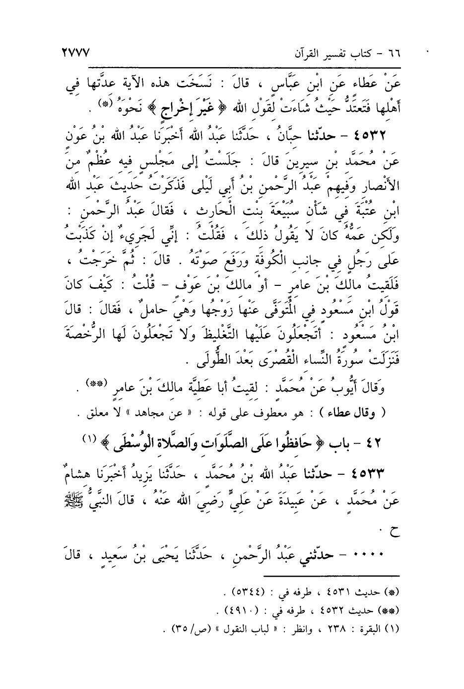 4532 - حَدَّثَنَا حِبَّانُ، حَدَّثَنَا عَبْدُ اللَّهِ، أَخْبَرَنَا عَبْدُ اللَّهِ بْنُ عَوْنٍ، عَنْ مُحَمَّدِ بْنِ سِيرِينَ، قَالَ: " جَلَسْتُ إِلَى مَجْلِسٍ فِيهِ عُظْمٌ مِنَ الأَنْصَارِ، وَفِيهِمْ عَبْدُ الرَّحْمَنِ بْنُ أَبِي لَيْلَى، فَذَكَرْتُ حَدِيثَ عَبْدِ اللَّهِ بْنِ عُتْبَةَ فِي شَأْنِ سُبَيْعَةَ بِنْتِ الحَارِثِ، فَقَالَ عَبْدُ الرَّحْمَنِ: وَلَكِنَّ عَمَّهُ كَانَ لاَ يَقُولُ ذَلِكَ، فَقُلْتُ: إِنِّي لَجَرِيءٌ إِنْ كَذَبْتُ عَلَى رَجُلٍ فِي جَانِبِ الكُوفَةِ، وَرَفَعَ صَوْتَهُ، قَالَ: ثُمَّ خَرَجْتُ فَلَقِيتُ مَالِكَ بْنَ عَامِرٍ، أَوْ مَالِكَ بْنَ عَوْفٍ قُلْتُ: كَيْفَ كَانَ قَوْلُ ابْنِ مَسْعُودٍ فِي المُتَوَفَّى عَنْهَا زَوْجُهَا وَهْيَ حَامِلٌ؟ فَقَالَ: قَالَ ابْنُ مَسْعُودٍ: " أَتَجْعَلُونَ عَلَيْهَا التَّغْلِيظَ، وَلاَ تَجْعَلُونَ لَهَا الرُّخْصَةَ، لَنَزَلَتْ سُورَةُ النِّسَاءِ القُصْرَى بَعْدَ الطُّولَى، وَقَالَ أَيُّوبُ: عَنْ مُحَمَّدٍ، لَقِيتُ أَبَا عَطِيَّةَ مَالِكَ بْنَ عَامِرٍ.