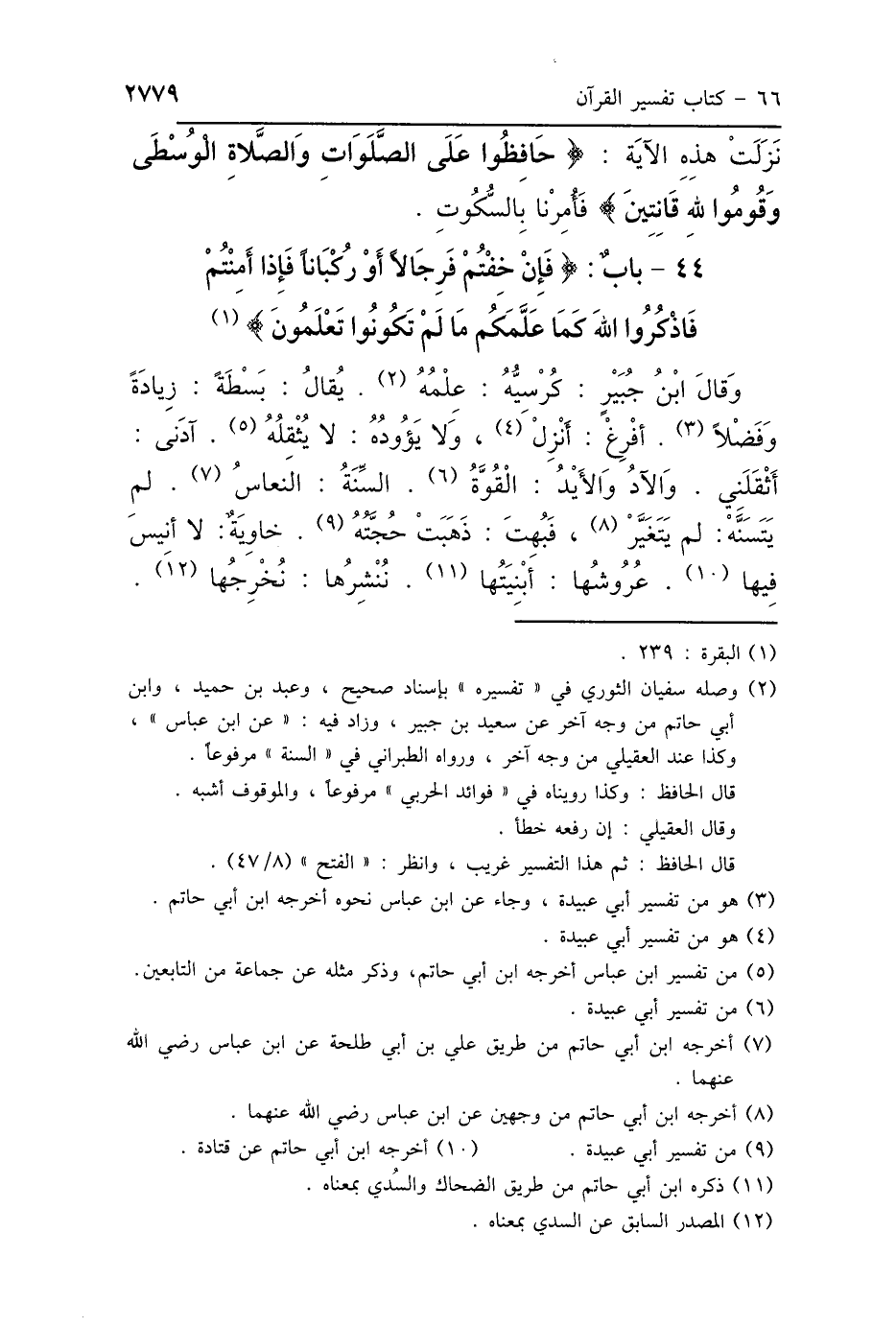 عَلَّمَكُمْ مَا لَمْ تَكُونُوا تَعْلَمُونَ} [البقرة: 239] وَقَالَ ابْنُ جُبَيْرٍ: {كُرْسِيُّهُ} [البقرة: 255]: «عِلْمُهُ»، يُقَالُ {بَسْطَةً} [البقرة: 247]: «زِيَادَةً وَفَضْلًا»، {أَفْرِغْ} [البقرة: 250]: «أَنْزِلْ»، {وَلاَ يَئُودُهُ}: «لاَ يُثْقِلُهُ، آدَنِي أَثْقَلَنِي، وَالآدُ وَالأَيْدُ القُوَّةُ» السِّنَةُ: «نُعَاسٌ» {يَتَسَنَّهْ} [البقرة: 259]: «يَتَغَيَّرْ»، {فَبُهِتَ} [البقرة: 258]: «ذَهَبَتْ حُجَّتُهُ»، {خَاوِيَةٌ} [البقرة: 259]: «لاَ أَنِيسَ فِيهَا»، {عُرُوشُهَا} [البقرة: 259]: «أَبْنِيَتُهَا» (نُنْشِرُهَا): «نُخْرِجُهَا»،