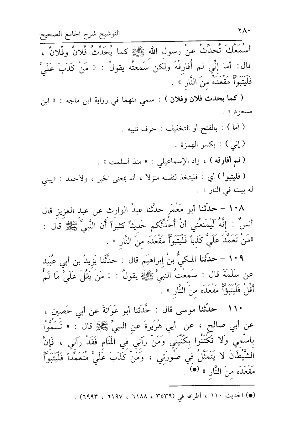 109 - حَدَّثَنَا مَكِّيُّ بْنُ إِبْرَاهِيمَ، قَالَ: حَدَّثَنَا يَزِيدُ بْنُ أَبِي عُبَيْدٍ، عَنْ سَلَمَةَ، قَالَ: سَمِعْتُ النَّبِيَّ صَلَّى اللهُ عَلَيْهِ وَسَلَّمَ يَقُولُ: «مَنْ يَقُلْ عَلَيَّ مَا لَمْ أَقُلْ فَلْيَتَبَوَّأْ مَقْعَدَهُ مِنَ النَّارِ».