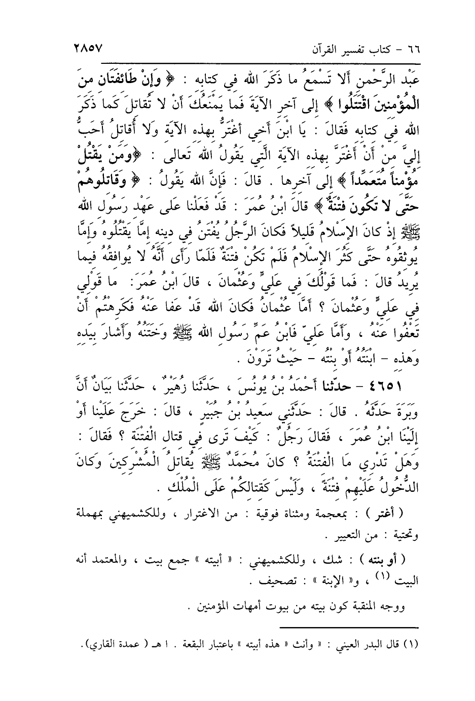 عَبْدِ الرَّحْمَنِ أَلاَ تَسْمَعُ مَا ذَكَرَ اللَّهُ فِي كِتَابِهِ: {وَإِنْ طَائِفَتَانِ مِنَ المُؤْمِنِينَ اقْتَتَلُوا} [الحجرات: 9] إِلَى آخِرِ الآيَةِ، فَمَا يَمْنَعُكَ أَنْ لاَ تُقَاتِلَ كَمَا ذَكَرَ اللَّهُ فِي كِتَابِهِ؟ فَقَالَ: " يَا ابْنَ أَخِي أَغْتَرُّ بِهَذِهِ الآيَةِ وَلاَ أُقَاتِلُ، أَحَبُّ إِلَيَّ مِنْ أَنْ أَغْتَرَّ بِهَذِهِ الآيَةِ، الَّتِي يَقُولُ اللَّهُ تَعَالَى: {وَمَنْ يَقْتُلْ مُؤْمِنًا مُتَعَمِّدًا} [النساء: 93] إِلَى آخِرِهَا "، قَالَ: فَإِنَّ اللَّهَ يَقُولُ: {وَقَاتِلُوهُمْ حَتَّى لاَ تَكُونَ فِتْنَةٌ} [الأنفال: 39]، قَالَ ابْنُ عُمَرَ: «قَدْ فَعَلْنَا عَلَى عَهْدِ رَسُولِ اللَّهِ صَلَّى اللهُ عَلَيْهِ وَسَلَّمَ إِذْ كَانَ الإِسْلاَمُ قَلِيلًا، فَكَانَ الرَّجُلُ يُفْتَنُ فِي دِينِهِ إِمَّا يَقْتُلُونَهُ وَإِمَّا يُوثِقُونَهُ، حَتَّى كَثُرَ الإِسْلاَمُ فَلَمْ تَكُنْ فِتْنَةٌ»، فَلَمَّا رَأَى أَنَّهُ لاَ يُوَافِقُهُ فِيمَا يُرِيدُ، قَالَ: «فَمَا قَوْلُكَ فِي عَلِيٍّ، وَعُثْمَانَ؟» قَالَ ابْنُ عُمَرَ: " مَا قَوْلِي فِي عَلِيٍّ، وَعُثْمَانَ؟ أَمَّا عُثْمَانُ: فَكَانَ اللَّهُ قَدْ عَفَا عَنْهُ فَكَرِهْتُمْ أَنْ يَعْفُوَ عَنْهُ، وَأَمَّا عَلِيٌّ: فَابْنُ عَمِّ رَسُولِ اللَّهِ صَلَّى اللهُ عَلَيْهِ وَسَلَّمَ وَخَتَنُهُ - وَأَشَارَ بِيَدِهِ - وَهَذِهِ ابْنَتُهُ - أَوْ بِنْتُهُ - حَيْثُ تَرَوْنَ.