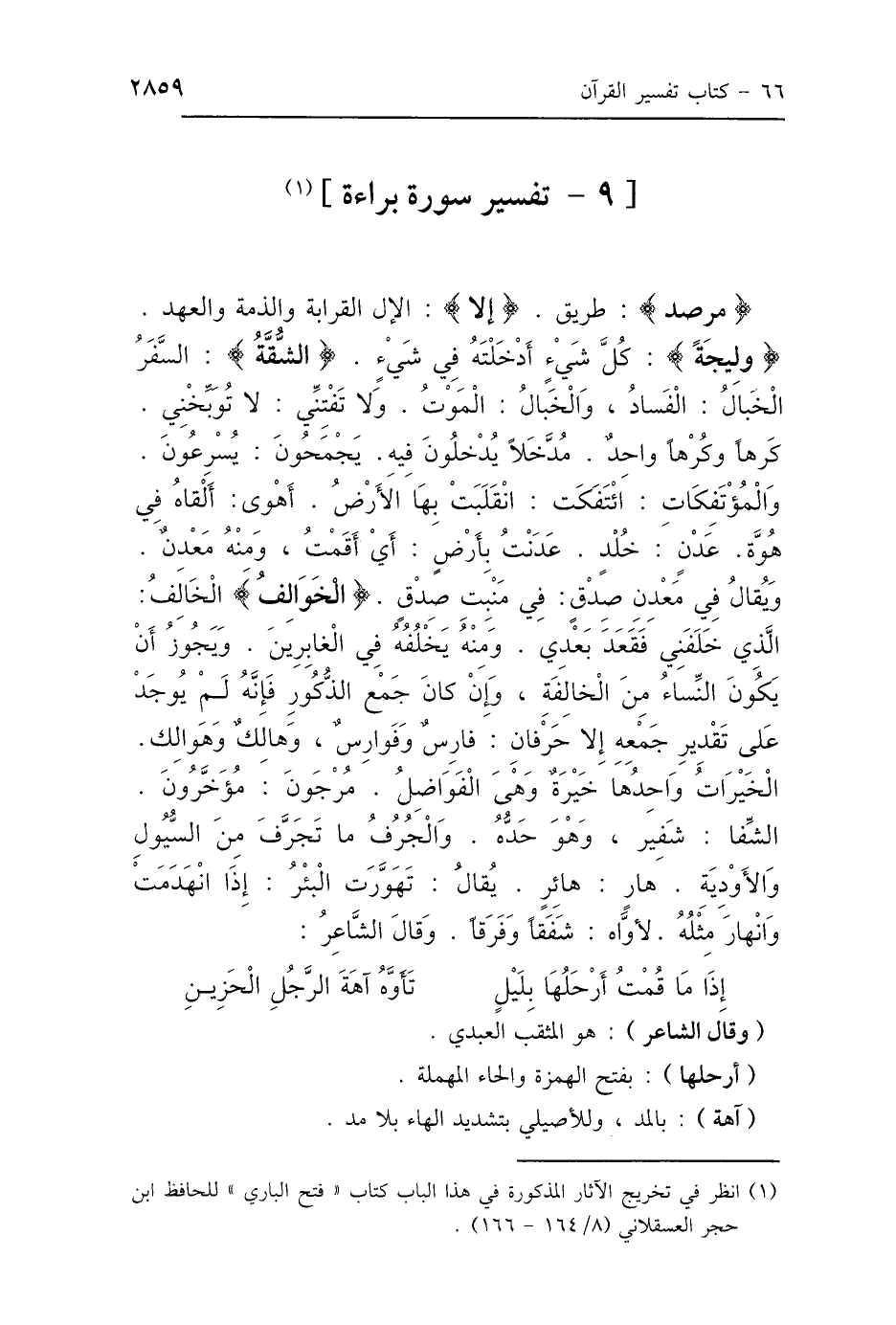 {وَلِيجَةً} [التوبة: 16]: «كُلُّ شَيْءٍ أَدْخَلْتَهُ فِي شَيْءٍ»، {الشُّقَّةُ} [التوبة: 42]: " السَّفَرُ، الخَبَالُ: الفَسَادُ، وَالخَبَالُ: المَوْتُ "، {وَلاَ تَفْتِنِّي} [التوبة: 49]: «لاَ تُوَبِّخْنِي»، {كَرْهًا} [النساء: 19] وَ {كُرْهًا} [النساء: 19]: «وَاحِدٌ»، {مُدَّخَلًا} [النساء: 31]: «يُدْخَلُونَ فِيهِ»، {يَجْمَحُونَ} [التوبة: 57]: «يُسْرِعُونَ»، {وَالمُؤْتَفِكَاتِ} [التوبة: 70]: " ائْتَفَكَتْ: انْقَلَبَتْ بِهَا الأَرْضُ "، {أَهْوَى} [النجم: 53]: «أَلْقَاهُ فِي هُوَّةٍ»، {عَدْنٍ} [التوبة: 72]: " خُلْدٍ، عَدَنْتُ بِأَرْضٍ: أَيْ أَقَمْتُ، وَمِنْهُ: مَعْدِنٌ، وَيُقَالُ: فِي مَعْدِنِ صِدْقٍ، فِي مَنْبَتِ صِدْقٍ "، {الخَوَالِفُ} [التوبة: 87]: «الخَالِفُ الَّذِي خَلَفَنِي، فَقَعَدَ بَعْدِي، وَمِنْهُ يَخْلُفُهُ فِي الغَابِرِينَ، وَيَجُوزُ أَنْ يَكُونَ النِّسَاءُ مِنَ الخَالِفَةِ، وَإِنْ كَانَ جَمْعَ الذُّكُورِ، فَإِنَّهُ لَمْ يُوجَدْ عَلَى تَقْدِيرِ جَمْعِهِ إِلَّا حَرْفَانِ فَارِسٌ، وَفَوَارِسُ وَهَالِكٌ وَهَوَالِكُ»، {الخَيْرَاتُ} [البقرة: 148]: «وَاحِدُهَا خَيْرَةٌ وَهِيَ الفَوَاضِلُ» (مُرْجَئُونَ): " مُؤَخَّرُونَ، الشَّفَا: شَفِيرٌ، وَهُوَ حَدُّهُ، وَالجُرُفُ مَا تَجَرَّفَ مِنَ السُّيُولِ وَالأَوْدِيَةِ "، {هَارٍ} [التوبة: 109]: " هَائِرٍ، يُقَالُ: تَهَوَّرَتِ البِئْرُ إِذَا انْهَدَمَتْ، وَانْهَارَ مِثْلُهُ ". {لَأَوَّاهٌ} [التوبة: 114]: " شَفَقًا، وَفَرَقًا، وَقَالَ الشَّاعِرُ: