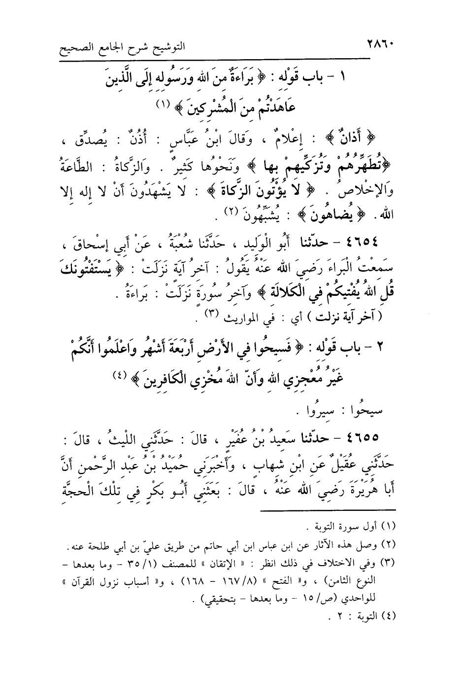 1 - بَابُ قَوْلِهِ: {بَرَاءَةٌ مِنَ اللَّهِ وَرَسُولِهِ إِلَى الَّذِينَ عَاهَدْتُمْ مِنَ المُشْرِكِينَ} [التوبة: 1]