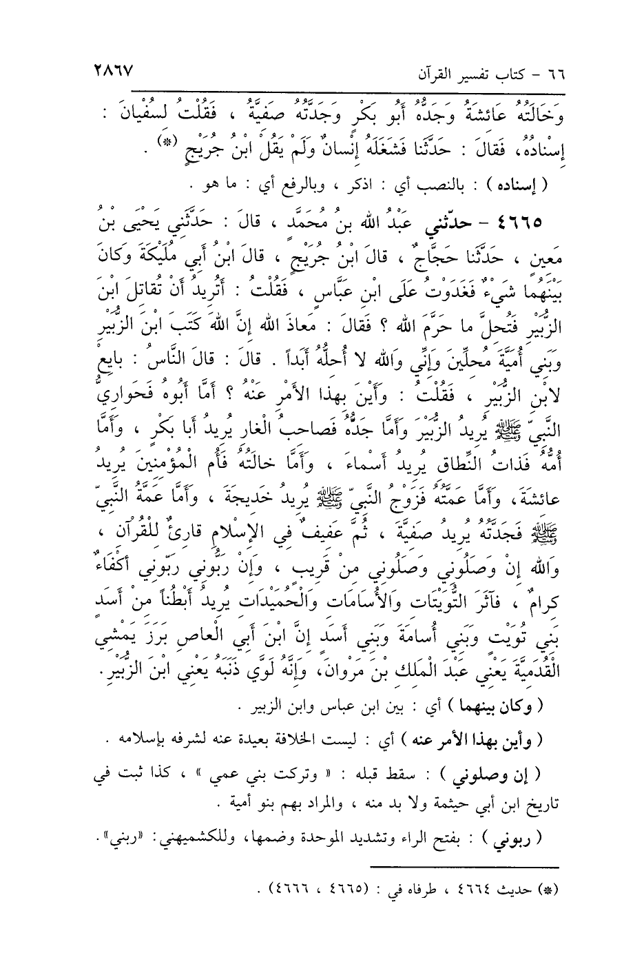 4665 - حَدَّثَنِي عَبْدُ اللَّهِ بْنُ مُحَمَّدٍ، قَالَ حَدَّثَنِي يَحْيَى بْنُ مَعِينٍ، حَدَّثَنَا حَجَّاجٌ، قَالَ ابْنُ جُرَيْجٍ: قَالَ ابْنُ أَبِي مُلَيْكَةَ: وَكَانَ بَيْنَهُمَا شَيْءٌ، فَغَدَوْتُ عَلَى ابْنِ عَبَّاسٍ، فَقُلْتُ: أَتُرِيدُ أَنْ تُقَاتِلَ ابْنَ الزُّبَيْرِ، فَتُحِلَّ حَرَمَ اللَّهِ؟ فَقَالَ: «مَعَاذَ اللَّهِ، إِنَّ اللَّهَ كَتَبَ ابْنَ الزُّبَيْرِ وَبَنِي أُمَيَّةَ مُحِلِّينَ، وَإِنِّي وَاللَّهِ لَا أُحِلُّهُ أَبَدًا»، قَالَ: قَالَ النَّاسُ: بَايِعْ لِابْنِ الزُّبَيْرِ فَقُلْتُ: " وَأَيْنَ بِهَذَا الأَمْرِ عَنْهُ، أَمَّا أَبُوهُ: فَحَوَارِيُّ النَّبِيِّ صَلَّى اللهُ عَلَيْهِ وَسَلَّمَ - يُرِيدُ الزُّبَيْرَ - وَأَمَّا جَدُّهُ: فَصَاحِبُ الغَارِ - يُرِيدُ أَبَا بَكْرٍ - وَأُمُّهُ: فَذَاتُ النِّطَاقِ - يُرِيدُ أَسْمَاءَ - وَأَمَّا خَالَتُهُ: فَأُمُّ المُؤْمِنِينَ - يُرِيدُ عَائِشَةَ - وَأَمَّا عَمَّتُهُ: فَزَوْجُ النَّبِيِّ صَلَّى اللهُ عَلَيْهِ وَسَلَّمَ - يُرِيدُ خَدِيجَةَ - وَأَمَّا عَمَّةُ النَّبِيِّ صَلَّى اللهُ عَلَيْهِ وَسَلَّمَ: فَجَدَّتُهُ - يُرِيدُ صَفِيَّةَ - ثُمَّ عَفِيفٌ فِي الإِسْلاَمِ، قَارِئٌ لِلْقُرْآنِ، وَاللَّهِ إِنْ وَصَلُونِي وَصَلُونِي مِنْ قَرِيبٍ، وَإِنْ رَبُّونِي رَبُّونِي أَكْفَاءٌ كِرَامٌ، فَآثَرَ التُّوَيْتَاتِ وَالْأُسَامَاتِ وَالْحُمَيْدَاتِ يُرِيدُ أَبْطُنًا مِنْ بَنِي أَسَدٍ بَنِي تُوَيْتٍ وَبَنِي أُسَامَةَ وَبَنِي أَسَدٍ، إِنَّ ابْنَ أَبِي العَاصِ بَرَزَ يَمْشِي القُدَمِيَّةَ - يَعْنِي عَبْدَ المَلِكِ بْنَ مَرْوَانَ - وَإِنَّهُ لَوَّى ذَنَبَهُ - يَعْنِي ابْنَ الزُّبَيْرِ -".