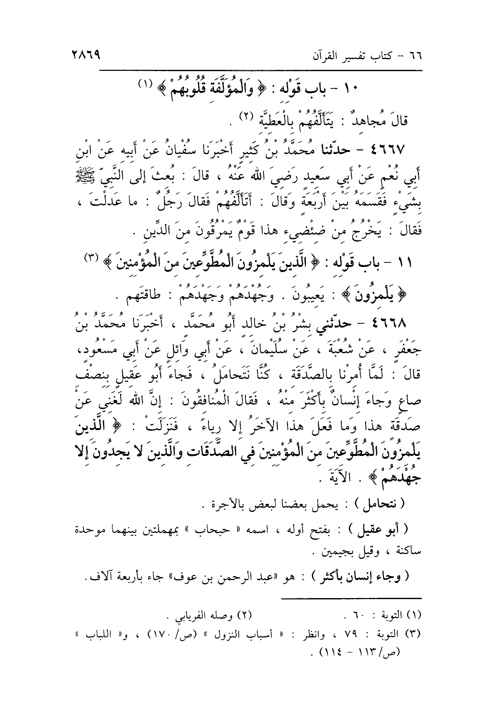 4668 - حَدَّثَنِي بِشْرُ بْنُ خَالِدٍ أَبُو مُحَمَّدٍ، أَخْبَرَنَا مُحَمَّدُ بْنُ جَعْفَرٍ، عَنْ شُعْبَةَ، عَنْ سُلَيْمَانَ، عَنْ أَبِي وَائِلٍ، عَنْ أَبِي مَسْعُودٍ، قَالَ: " لَمَّا أُمِرْنَا بِالصَّدَقَةِ كُنَّا نَتَحَامَلُ، فَجَاءَ أَبُو عَقِيلٍ بِنِصْفِ صَاعٍ، وَجَاءَ إِنْسَانٌ بِأَكْثَرَ مِنْهُ، فَقَالَ المُنَافِقُونَ: إِنَّ اللَّهَ لَغَنِيٌّ عَنْ صَدَقَةِ هَذَا، وَمَا فَعَلَ هَذَا الآخَرُ إِلَّا رِئَاءً، فَنَزَلَتْ: {الَّذِينَ يَلْمِزُونَ المُطَّوِّعِينَ مِنَ المُؤْمِنِينَ فِي الصَّدَقَاتِ، وَالَّذِينَ لاَ يَجِدُونَ إِلَّا جُهْدَهُمْ} [التوبة: 79] " الآيَةَ.