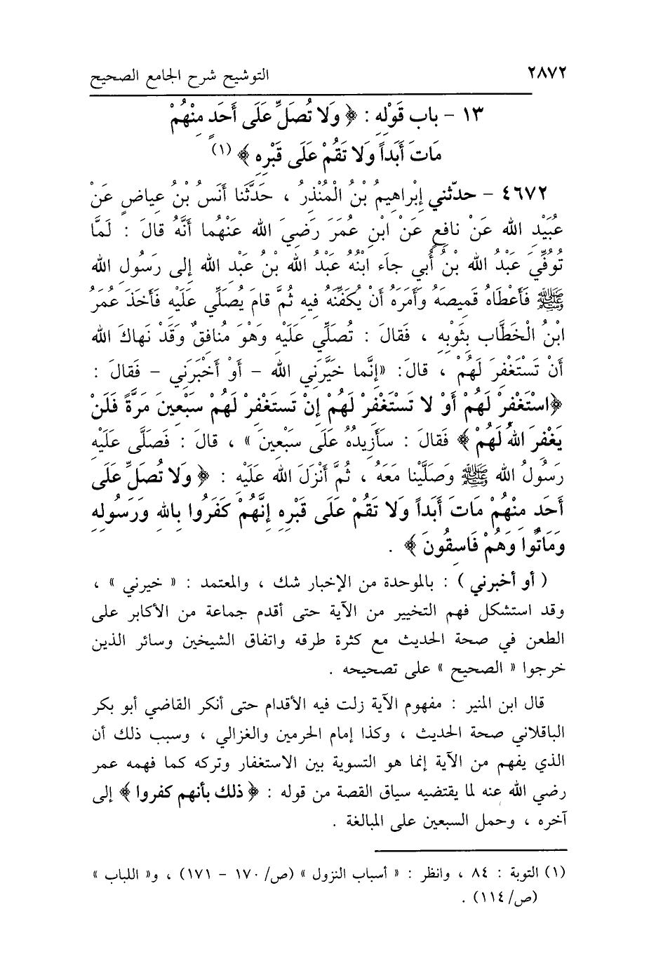 4672 - حَدَّثَنِي إِبْرَاهِيمُ بْنُ المُنْذِرِ، حَدَّثَنَا أَنَسُ بْنُ عِيَاضٍ، عَنْ عُبَيْدِ اللَّهِ، عَنْ نَافِعٍ، عَنِ ابْنِ عُمَرَ رَضِيَ اللَّهُ عَنْهُمَا، أَنَّهُ قَالَ: لَمَّا تُوُفِّيَ عَبْدُ اللَّهِ بْنُ أُبَيٍّ، جَاءَ ابْنُهُ عَبْدُ اللَّهِ بْنُ عَبْدِ اللَّهِ إِلَى رَسُولِ اللَّهِ صَلَّى اللهُ عَلَيْهِ وَسَلَّمَ فَأَعْطَاهُ قَمِيصَهُ، وَأَمَرَهُ أَنْ يُكَفِّنَهُ فِيهِ، ثُمَّ قَامَ يُصَلِّي عَلَيْهِ فَأَخَذَ عُمَرُ بْنُ الخَطَّابِ بِثَوْبِهِ، فَقَالَ: تُصَلِّي عَلَيْهِ وَهُوَ مُنَافِقٌ، وَقَدْ نَهَاكَ اللَّهُ أَنْ تَسْتَغْفِرَ لَهُمْ؟ قَالَ: " إِنَّمَا خَيَّرَنِي اللَّهُ - أَوْ أَخْبَرَنِي اللَّهُ - فَقَالَ: {اسْتَغْفِرْ لَهُمْ، أَوْ لاَ تَسْتَغْفِرْ لَهُمْ، إِنْ تَسْتَغْفِرْ لَهُمْ سَبْعِينَ مَرَّةً فَلَنْ يَغْفِرَ اللَّهُ لَهُمْ} [التوبة: 80] فَقَالَ سَأَزِيدُهُ عَلَى سَبْعِينَ " قَالَ: فَصَلَّى عَلَيْهِ رَسُولُ اللَّهِ صَلَّى اللهُ عَلَيْهِ وَسَلَّمَ وَصَلَّيْنَا مَعَهُ، ثُمَّ أَنْزَلَ اللَّهُ عَلَيْهِ: {وَلاَ تُصَلِّ عَلَى أَحَدٍ مِنْهُمْ مَاتَ أَبَدًا، وَلاَ تَقُمْ عَلَى قَبْرِهِ إِنَّهُمْ كَفَرُوا بِاللَّهِ وَرَسُولِهِ، وَمَاتُوا وَهُمْ فَاسِقُونَ} [التوبة: 84].