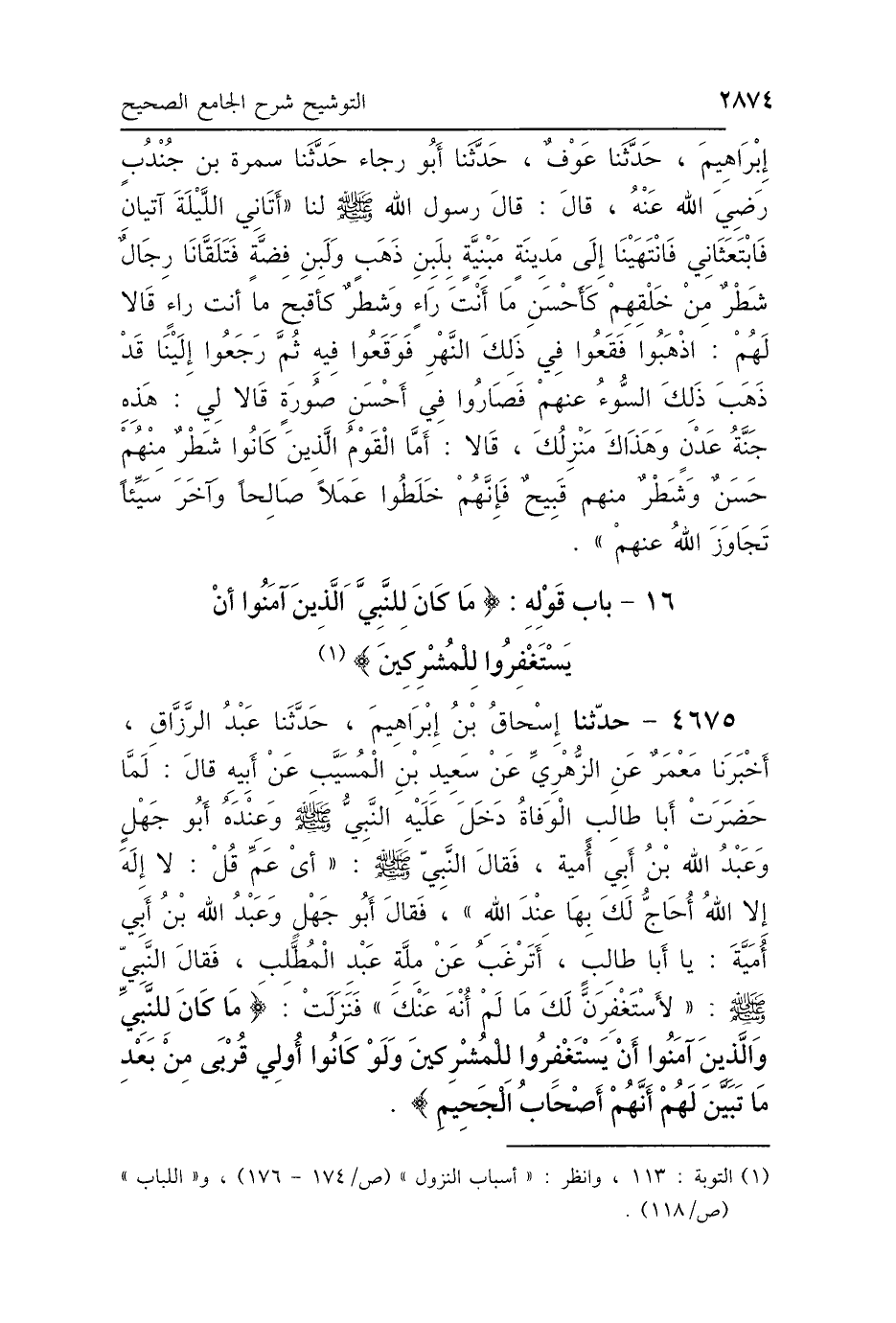 4675 - حَدَّثَنَا إِسْحَاقُ بْنُ إِبْرَاهِيمَ، حَدَّثَنَا عَبْدُ الرَّزَّاقِ، أَخْبَرَنَا مَعْمَرٌ، عَنِ الزُّهْرِيِّ، عَنْ سَعِيدِ بْنِ المُسَيِّبِ، عَنْ أَبِيهِ، قَالَ: لَمَّا حَضَرَتْ أَبَا طَالِبٍ الوَفَاةُ دَخَلَ عَلَيْهِ النَّبِيُّ صَلَّى اللهُ عَلَيْهِ وَسَلَّمَ، وَعِنْدَهُ أَبُو جَهْلٍ وَعَبْدُ اللَّهِ بْنُ أَبِي أُمَيَّةَ، فَقَالَ النَّبِيُّ صَلَّى اللهُ عَلَيْهِ وَسَلَّمَ: " أَيْ عَمِّ، قُلْ: لاَ إِلَهَ إِلَّا اللَّهُ أُحَاجُّ لَكَ بِهَا عِنْدَ اللَّهِ "، فَقَالَ أَبُو جَهْلٍ، وَعَبْدُ اللَّهِ بْنُ أَبِي أُمَيَّةَ: يَا أَبَا طَالِبٍ أَتَرْغَبُ عَنْ مِلَّةِ عَبْدِ المُطَّلِبِ، فَقَالَ النَّبِيُّ صَلَّى اللهُ عَلَيْهِ وَسَلَّمَ: «لَأَسْتَغْفِرَنَّ لَكَ مَا لَمْ أُنْهَ عَنْكَ»، فَنَزَلَتْ: {مَا كَانَ لِلنَّبِيِّ وَالَّذِينَ آمَنُوا أَنْ يَسْتَغْفِرُوا لِلْمُشْرِكِينَ وَلَوْ كَانُوا أُولِي قُرْبَى، مِنْ بَعْدِ مَا تَبَيَّنَ لَهُمْ أَنَّهُمْ أَصْحَابُ الجَحِيمِ} [التوبة: 113].