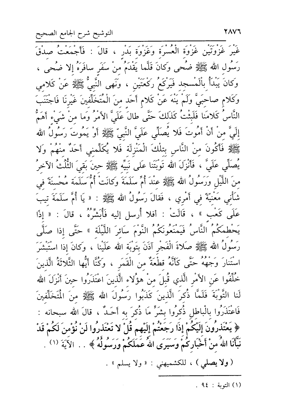 غَيْرَ غَزْوَتَيْنِ غَزْوَةِ العُسْرَةِ، وَغَزْوَةِ بَدْرٍ - قَالَ: فَأَجْمَعْتُ صِدْقِي رَسُولَ اللَّهِ صَلَّى اللهُ عَلَيْهِ وَسَلَّمَ ضُحًى، وَكَانَ قَلَّمَا يَقْدَمُ مِنْ سَفَرٍ سَافَرَهُ إِلَّا ضُحًى، وَكَانَ يَبْدَأُ بِالْمَسْجِدِ فَيَرْكَعُ رَكْعَتَيْنِ، وَنَهَى النَّبِيُّ صَلَّى اللهُ عَلَيْهِ وَسَلَّمَ عَنْ كَلاَمِي، وَكَلاَمِ صَاحِبَيَّ، وَلَمْ يَنْهَ عَنْ كَلاَمِ أَحَدٍ مِنَ المُتَخَلِّفِينَ غَيْرِنَا، فَاجْتَنَبَ النَّاسُ كَلاَمَنَا، فَلَبِثْتُ كَذَلِكَ حَتَّى طَالَ عَلَيَّ الأَمْرُ، وَمَا مِنْ شَيْءٍ أَهَمُّ إِلَيَّ مِنْ أَنْ أَمُوتَ فَلاَ يُصَلِّي عَلَيَّ النَّبِيُّ صَلَّى اللهُ عَلَيْهِ وَسَلَّمَ، أَوْ يَمُوتَ رَسُولُ اللَّهِ صَلَّى اللهُ عَلَيْهِ وَسَلَّمَ فَأَكُونَ مِنَ النَّاسِ بِتِلْكَ المَنْزِلَةِ فَلاَ يُكَلِّمُنِي أَحَدٌ مِنْهُمْ، وَلاَ يُصَلِّي وَلاَ يُسَلِّمُ عَلَيَّ فَأَنْزَلَ اللَّهُ تَوْبَتَنَا عَلَى نَبِيِّهِ صَلَّى اللهُ عَلَيْهِ وَسَلَّمَ، حِينَ بَقِيَ الثُّلُثُ الآخِرُ مِنَ اللَّيْلِ، وَرَسُولُ اللَّهِ صَلَّى اللهُ عَلَيْهِ وَسَلَّمَ عِنْدَ أُمِّ سَلَمَةَ، وَكَانَتْ أُمُّ سَلَمَةَ مُحْسِنَةً فِي شَأْنِي مَعْنِيَّةً فِي أَمْرِي، فَقَالَ رَسُولُ اللَّهِ صَلَّى اللهُ عَلَيْهِ وَسَلَّمَ: «يَا أُمَّ سَلَمَةَ تِيبَ عَلَى كَعْبٍ» قَالَتْ: أَفَلاَ أُرْسِلُ إِلَيْهِ فَأُبَشِّرَهُ؟ قَالَ: «إِذًا يَحْطِمَكُمُ النَّاسُ فَيَمْنَعُونَكُمُ النَّوْمَ سَائِرَ اللَّيْلَةِ» حَتَّى إِذَا صَلَّى رَسُولُ اللَّهِ صَلَّى اللهُ عَلَيْهِ وَسَلَّمَ صَلاَةَ الفَجْرِ آذَنَ بِتَوْبَةِ اللَّهِ عَلَيْنَا، وَكَانَ إِذَا اسْتَبْشَرَ اسْتَنَارَ وَجْهُهُ، حَتَّى كَأَنَّهُ قِطْعَةٌ مِنَ القَمَرِ، وَكُنَّا أَيُّهَا الثَّلاَثَةُ الَّذِينَ خُلِّفُوا عَنِ الأَمْرِ الَّذِي قُبِلَ مِنْ هَؤُلاَءِ الَّذِينَ اعْتَذَرُوا، حِينَ أَنْزَلَ اللَّهُ لَنَا التَّوْبَةَ، فَلَمَّا ذُكِرَ الَّذِينَ كَذَبُوا رَسُولَ اللَّهِ صَلَّى اللهُ عَلَيْهِ وَسَلَّمَ مِنَ المُتَخَلِّفِينَ وَاعْتَذَرُوا بِالْبَاطِلِ، ذُكِرُوا بِشَرِّ مَا ذُكِرَ بِهِ أَحَدٌ، قَالَ اللَّهُ سُبْحَانَهُ: {يَعْتَذِرُونَ إِلَيْكُمْ إِذَا رَجَعْتُمْ إِلَيْهِمْ، قُلْ: لاَ تَعْتَذِرُوا لَنْ نُؤْمِنَ لَكُمْ قَدْ نَبَّأَنَا اللَّهُ مِنْ أَخْبَارِكُمْ، وَسَيَرَى اللَّهُ عَمَلَكُمْ وَرَسُولُهُ} [التوبة: 94] الآيَةَ.