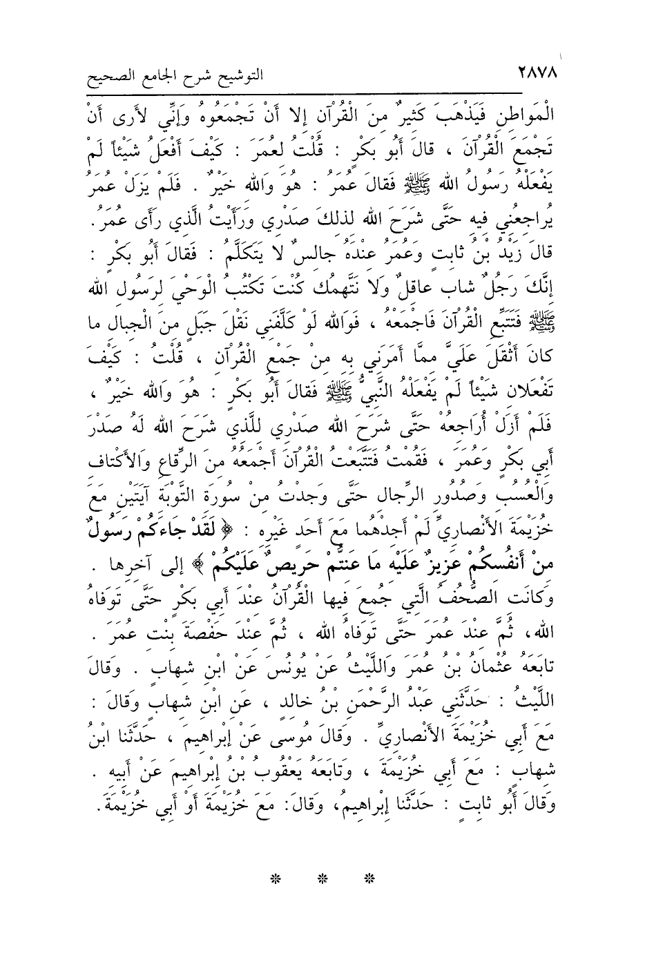المَوَاطِنِ، فَيَذْهَبَ كَثِيرٌ مِنَ القُرْآنِ إِلَّا أَنْ تَجْمَعُوهُ، وَإِنِّي لَأَرَى أَنْ تَجْمَعَ القُرْآنَ "، قَالَ أَبُو بَكْرٍ: قُلْتُ لِعُمَرَ: «كَيْفَ أَفْعَلُ شَيْئًا لَمْ يَفْعَلْهُ رَسُولُ اللَّهِ صَلَّى اللهُ عَلَيْهِ وَسَلَّمَ؟» فَقَالَ عُمَرُ: هُوَ وَاللَّهِ خَيْرٌ، فَلَمْ يَزَلْ عُمَرُ يُرَاجِعُنِي فِيهِ حَتَّى شَرَحَ اللَّهُ لِذَلِكَ صَدْرِي، وَرَأَيْتُ الَّذِي رَأَى عُمَرُ، قَالَ زَيْدُ بْنُ ثَابِتٍ: وَعُمَرُ عِنْدَهُ جَالِسٌ لاَ يَتَكَلَّمُ، فَقَالَ أَبُو بَكْرٍ: إِنَّكَ رَجُلٌ شَابٌّ عَاقِلٌ، وَلاَ نَتَّهِمُكَ، «كُنْتَ تَكْتُبُ الوَحْيَ لِرَسُولِ اللَّهِ صَلَّى اللهُ عَلَيْهِ وَسَلَّمَ»، فَتَتَبَّعِ القُرْآنَ فَاجْمَعْهُ، فَوَاللَّهِ لَوْ كَلَّفَنِي نَقْلَ جَبَلٍ مِنَ الجِبَالِ مَا كَانَ أَثْقَلَ عَلَيَّ مِمَّا أَمَرَنِي بِهِ مِنْ جَمْعِ القُرْآنِ، قُلْتُ: «كَيْفَ تَفْعَلاَنِ شَيْئًا لَمْ يَفْعَلْهُ النَّبِيُّ صَلَّى اللهُ عَلَيْهِ وَسَلَّمَ؟» فَقَالَ أَبُو بَكْرٍ: هُوَ وَاللَّهِ خَيْرٌ، فَلَمْ أَزَلْ أُرَاجِعُهُ حَتَّى شَرَحَ اللَّهُ صَدْرِي لِلَّذِي شَرَحَ اللَّهُ لَهُ صَدْرَ أَبِي بَكْرٍ وَعُمَرَ، فَقُمْتُ فَتَتَبَّعْتُ القُرْآنَ أَجْمَعُهُ مِنَ الرِّقَاعِ وَالأَكْتَافِ، وَالعُسُبِ وَصُدُورِ الرِّجَالِ، حَتَّى وَجَدْتُ مِنْ سُورَةِ التَّوْبَةِ آيَتَيْنِ مَعَ خُزَيْمَةَ الأَنْصَارِيِّ لَمْ أَجِدْهُمَا مَعَ أَحَدٍ غَيْرِهِ، {لَقَدْ جَاءَكُمْ رَسُولٌ مِنْ أَنْفُسِكُمْ عَزِيزٌ عَلَيْهِ مَا عَنِتُّمْ حَرِيصٌ عَلَيْكُمْ} [التوبة: 128] إِلَى آخِرِهِمَا، وَكَانَتِ الصُّحُفُ الَّتِي جُمِعَ فِيهَا القُرْآنُ عِنْدَ أَبِي بَكْرٍ حَتَّى تَوَفَّاهُ اللَّهُ، ثُمَّ عِنْدَ عُمَرَ حَتَّى تَوَفَّاهُ اللَّهُ، ثُمَّ عِنْدَ حَفْصَةَ بِنْتِ عُمَرَ تَابَعَهُ عُثْمَانُ بْنُ عُمَرَ، وَاللَّيْثُ، عَنْ يُونُسَ، عَنْ ابْنِ شِهَابٍ، وَقَالَ اللَّيْثُ: حَدَّثَنِي عَبْدُ الرَّحْمَنِ بْنُ خَالِدٍ، عَنْ ابْنِ شِهَابٍ، وَقَالَ: مَعَ أَبِي خُزَيْمَةَ الأَنْصَارِيِّ، وَقَالَ مُوسَى: عَنْ إِبْرَاهِيمَ، حَدَّثَنَا ابْنُ شِهَابٍ، مَعَ أَبِي خُزَيْمَةَ، وَتَابَعَهُ يَعْقُوبُ بْنُ إِبْرَاهِيمَ، عَنْ أَبِيهِ، وَقَالَ أَبُو ثَابِتٍ: حَدَّثَنَا إِبْرَاهِيمُ. وَقَالَ: مَعَ خُزَيْمَةَ أَوْ أَبِي خُزَيْمَةَ.