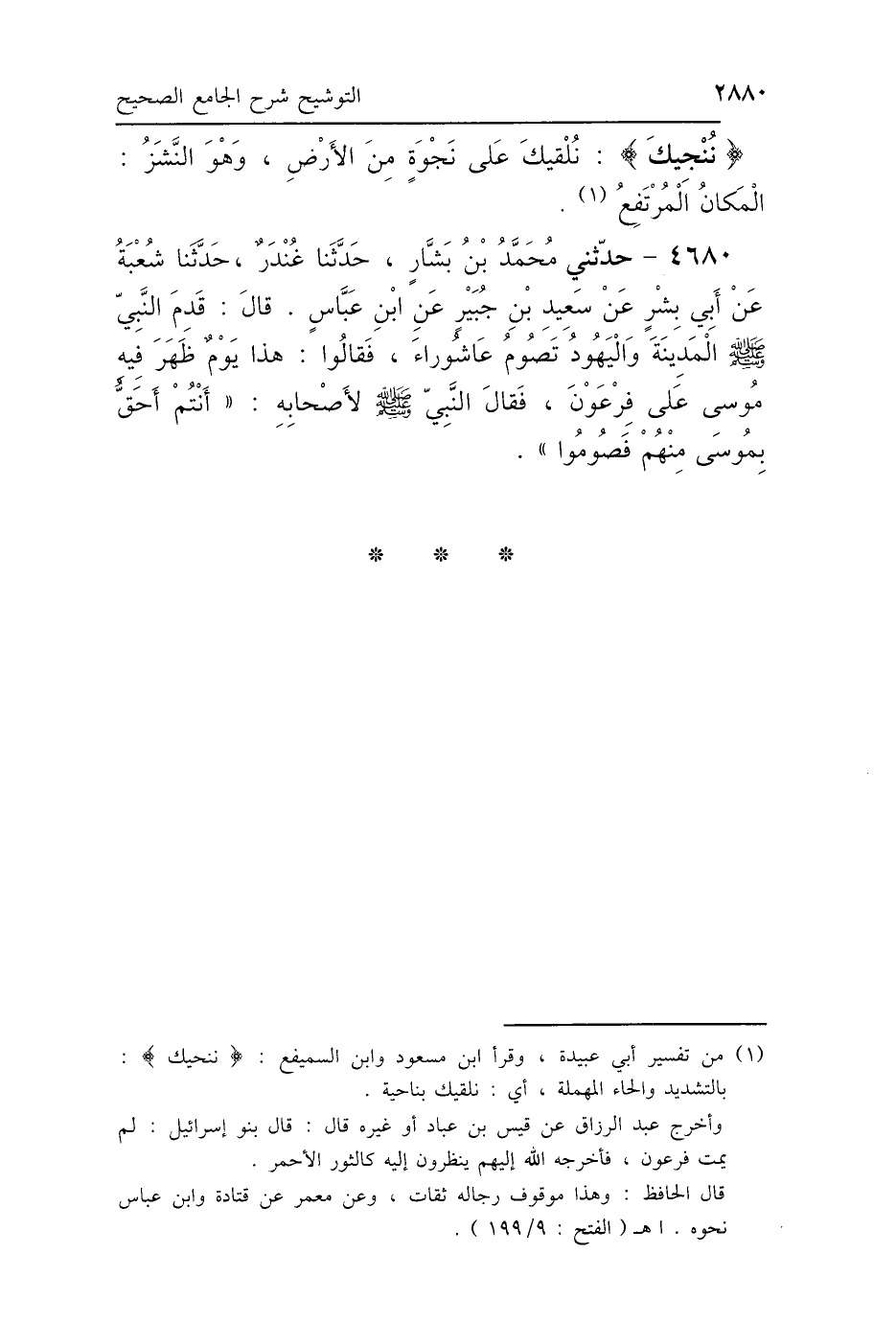 4680 - حَدَّثَنِي مُحَمَّدُ بْنُ بَشَّارٍ، حَدَّثَنَا غُنْدَرٌ، حَدَّثَنَا شُعْبَةُ، عَنْ أَبِي بِشْرٍ، عَنْ سَعِيدِ بْنِ جُبَيْرٍ، عَنِ ابْنِ عَبَّاسٍ، قَالَ: قَدِمَ النَّبِيُّ صَلَّى اللهُ عَلَيْهِ وَسَلَّمَ المَدِينَةَ وَاليَهُودُ تَصُومُ عَاشُورَاءَ، فَقَالُوا: هَذَا يَوْمٌ ظَهَرَ فِيهِ مُوسَى عَلَى فِرْعَوْنَ، فَقَالَ النَّبِيُّ صَلَّى اللهُ عَلَيْهِ وَسَلَّمَ لِأَصْحَابِهِ: «أَنْتُمْ أَحَقُّ بِمُوسَى مِنْهُمْ فَصُومُوا».