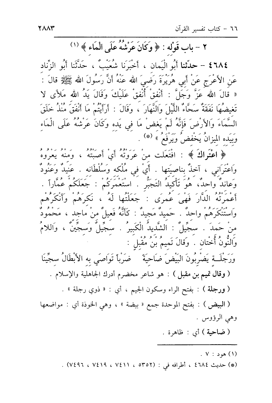 4684 - حَدَّثَنَا أَبُو اليَمَانِ، أَخْبَرَنَا شُعَيْبٌ، حَدَّثَنَا أَبُو الزِّنَادِ، عَنِ الأَعْرَجِ، عَنْ أَبِي هُرَيْرَةَ رَضِيَ اللَّهُ عَنْهُ: أَنَّ رَسُولَ اللَّهِ صَلَّى اللهُ عَلَيْهِ وَسَلَّمَ قَالَ: " قَالَ اللَّهُ عَزَّ وَجَلَّ: أَنْفِقْ أُنْفِقْ عَلَيْكَ، وَقَالَ: يَدُ اللَّهِ مَلْأَى لاَ تَغِيضُهَا نَفَقَةٌ سَحَّاءُ اللَّيْلَ وَالنَّهَارَ، وَقَالَ: أَرَأَيْتُمْ مَا أَنْفَقَ مُنْذُ خَلَقَ السَّمَاءَ وَالأَرْضَ، فَإِنَّهُ لَمْ يَغِضْ مَا فِي يَدِهِ، وَكَانَ عَرْشُهُ عَلَى المَاءِ، وَبِيَدِهِ المِيزَانُ يَخْفِضُ وَيَرْفَعُ " {اعْتَرَاكَ} [هود: 54]: «افْتَعَلَكَ، مِنْ عَرَوْتُهُ أَيْ أَصَبْتُهُ، وَمِنْهُ يَعْرُوهُ وَاعْتَرَانِي» {آخِذٌ بِنَاصِيَتِهَا} [هود: 56]: «أَيْ فِي مِلْكِهِ وَسُلْطَانِهِ»، {عَنِيدٌ} [هود: 59]: «وَعَنُودٌ وَعَانِدٌ وَاحِدٌ، هُوَ تَأْكِيدُ التَّجَبُّرِ»، {اسْتَعْمَرَكُمْ} [هود: 61]: «جَعَلَكُمْ عُمَّارًا، أَعْمَرْتُهُ الدَّارَ فَهِيَ عُمْرَى جَعَلْتُهَا لَهُ»، {نَكِرَهُمْ} [هود: 70]: «وَأَنْكَرَهُمْ وَاسْتَنْكَرَهُمْ وَاحِدٌ»، {حَمِيدٌ مَجِيدٌ} [هود: 73]: «كَأَنَّهُ فَعِيلٌ مِنْ مَاجِدٍ، مَحْمُودٌ مِنْ حَمِدَ»، {سِجِّيلٌ} [هود: 82]: " الشَّدِيدُ الكَبِيرُ، سِجِّيلٌ وَسِجِّينٌ، وَاللَّامُ وَالنُّونُ أُخْتَانِ، وَقَالَ تَمِيمُ بْنُ مُقْبِلٍ: