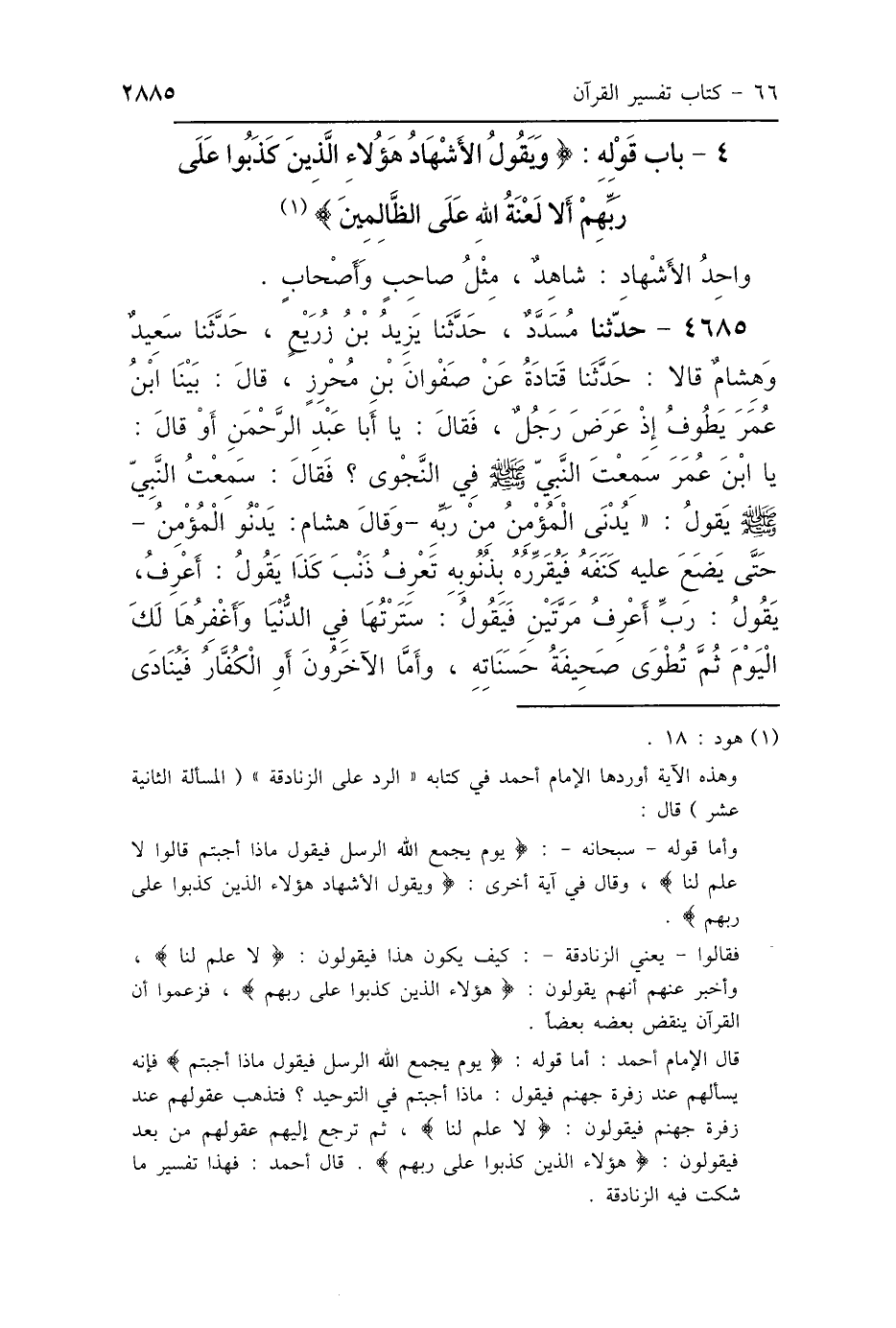 4685 - حَدَّثَنَا مُسَدَّدٌ، حَدَّثَنَا يَزِيدُ بْنُ زُرَيْعٍ، حَدَّثَنَا سَعِيدٌ، وَهِشَامٌ، قَالاَ: حَدَّثَنَا قَتَادَةُ، عَنْ صَفْوَانَ بْنِ مُحْرِزٍ، قَالَ: بَيْنَا ابْنُ عُمَرَ يَطُوفُ إِذْ عَرَضَ رَجُلٌ، فَقَالَ: يَا أَبَا عَبْدِ الرَّحْمَنِ - أَوْ قَالَ: يَا ابْنَ عُمَرَ - سَمِعْتَ النَّبِيَّ صَلَّى اللهُ عَلَيْهِ وَسَلَّمَ فِي النَّجْوَى؟ فَقَالَ سَمِعْتُ النَّبِيَّ صَلَّى اللهُ عَلَيْهِ وَسَلَّمَ يَقُولُ: " يُدْنَى المُؤْمِنُ مِنْ رَبِّهِ - وَقَالَ هِشَامٌ: يَدْنُو المُؤْمِنُ - حَتَّى يَضَعَ عَلَيْهِ كَنَفَهُ فَيُقَرِّرُهُ بِذُنُوبِهِ، تَعْرِفُ ذَنْبَ كَذَا؟ يَقُولُ: أَعْرِفُ، يَقُولُ: رَبِّ أَعْرِفُ مَرَّتَيْنِ، فَيَقُولُ: سَتَرْتُهَا فِي الدُّنْيَا، وَأَغْفِرُهَا لَكَ اليَوْمَ، ثُمَّ تُطْوَى صَحِيفَةُ حَسَنَاتِهِ، وَأَمَّا الآخَرُونَ - أَوِ الكُفَّارُ - فَيُنَادَى