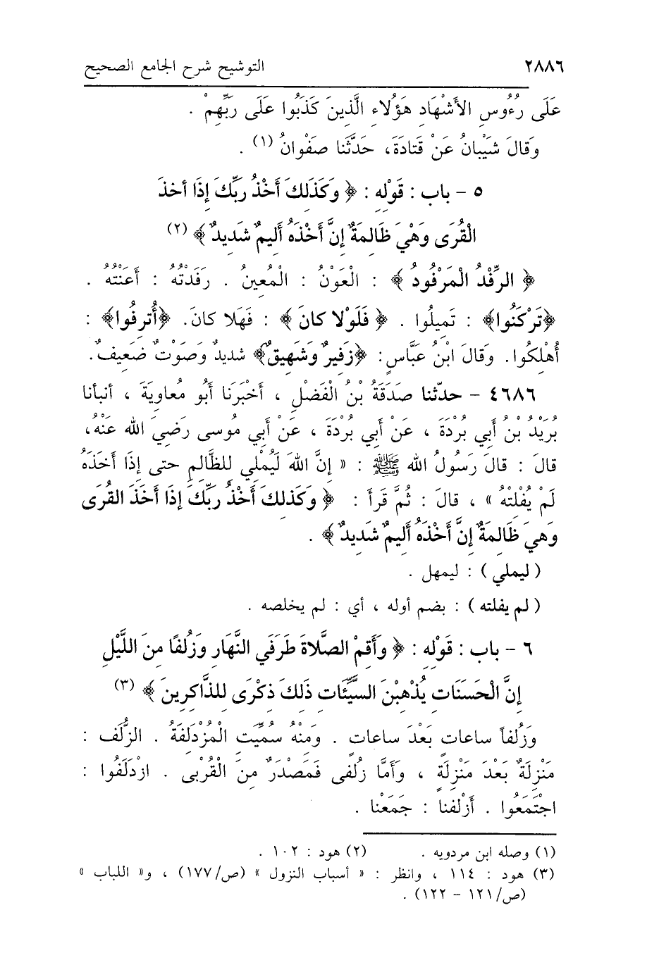 {الرِّفْدُ المَرْفُودُ} [هود: 99]: " العَوْنُ المُعِينُ، رَفَدْتُهُ: أَعَنْتُهُ "، {تَرْكَنُوا} [هود: 113]: «تَمِيلُوا»، {فَلَوْلاَ كَانَ} [هود: 116]: «فَهَلَّا كَانَ»، {أُتْرِفُوا} [هود: 116] «أُهْلِكُوا» وَقَالَ ابْنُ عَبَّاسٍ: «زَفِيرٌ وَشَهِيقٌ شَدِيدٌ وَصَوْتٌ ضَعِيفٌ».