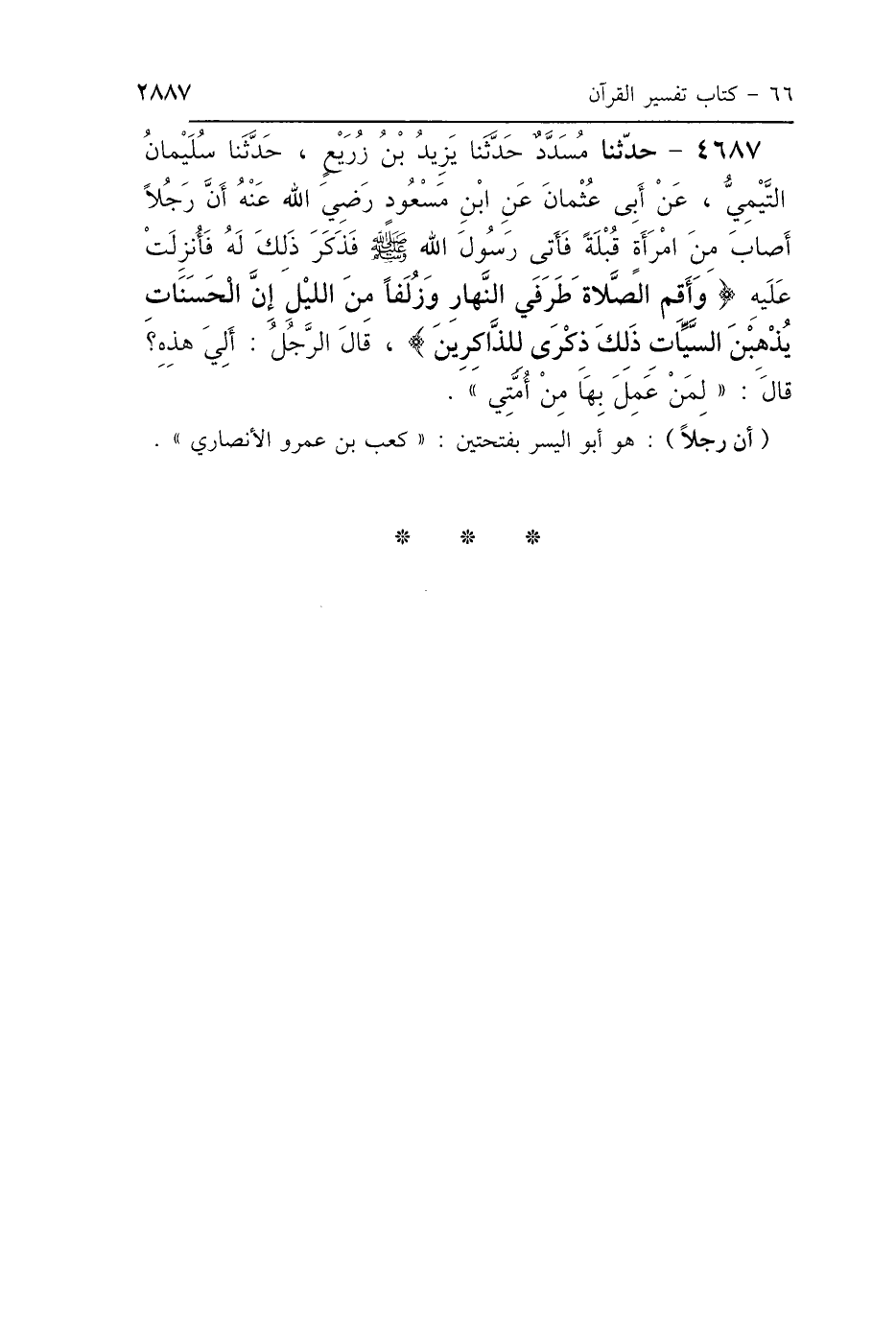 4687 - حَدَّثَنَا مُسَدَّدٌ، حَدَّثَنَا يَزِيدُ هُوَ ابْنُ زُرَيْعٍ، حَدَّثَنَا سُلَيْمَانُ التَّيْمِيُّ، عَنْ أَبِي عُثْمَانَ، عَنِ ابْنِ مَسْعُودٍ رَضِيَ اللَّهُ عَنْهُ: أَنَّ رَجُلًا أَصَابَ مِنَ امْرَأَةٍ قُبْلَةً، فَأَتَى رَسُولَ اللَّهِ صَلَّى اللهُ عَلَيْهِ وَسَلَّمَ فَذَكَرَ ذَلِكَ لَهُ، فَأُنْزِلَتْ عَلَيْهِ: {وَأَقِمِ الصَّلاَةَ طَرَفَيِ النَّهَارِ، وَزُلَفًا مِنَ اللَّيْلِ إِنَّ الحَسَنَاتِ يُذْهِبْنَ السَّيِّئَاتِ، ذَلِكَ ذِكْرَى لِلذَّاكِرِينَ} [هود: 114] قَالَ الرَّجُلُ: أَلِيَ هَذِهِ؟ قَالَ: «لِمَنْ عَمِلَ بِهَا مِنْ أُمَّتِي».