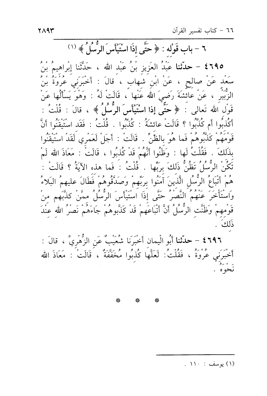 4695 - حَدَّثَنَا عَبْدُ العَزِيزِ بْنُ عَبْدِ اللَّهِ، حَدَّثَنَا إِبْرَاهِيمُ بْنُ سَعْدٍ، عَنْ صَالِحٍ، عَنِ ابْنِ شِهَابٍ، قَالَ: أَخْبَرَنِي عُرْوَةُ بْنُ الزُّبَيْرِ، عَنْ عَائِشَةَ رَضِيَ اللَّهُ عَنْهَا، قَالَتْ لَهُ وَهُوَ يَسْأَلُهَا عَنْ قَوْلِ اللَّهِ تَعَالَى: {حَتَّى إِذَا اسْتَيْأَسَ الرُّسُلُ} [يوسف: 110] قَالَ: قُلْتُ: أَكُذِبُوا أَمْ كُذِّبُوا؟ قَالَتْ عَائِشَةُ: «كُذِّبُوا» قُلْتُ: فَقَدِ اسْتَيْقَنُوا أَنَّ قَوْمَهُمْ كَذَّبُوهُمْ فَمَا هُوَ بِالظَّنِّ؟ قَالَتْ: «أَجَلْ لَعَمْرِي لَقَدِ اسْتَيْقَنُوا بِذَلِكَ» فَقُلْتُ لَهَا: وَظَنُّوا أَنَّهُمْ قَدْ كُذِبُوا، قَالَتْ: «مَعَاذَ اللَّهِ لَمْ تَكُنِ الرُّسُلُ تَظُنُّ ذَلِكَ بِرَبِّهَا» قُلْتُ: فَمَا هَذِهِ الآيَةُ؟ قَالَتْ: «هُمْ أَتْبَاعُ الرُّسُلِ الَّذِينَ آمَنُوا بِرَبِّهِمْ، وَصَدَّقُوهُمْ فَطَالَ عَلَيْهِمُ البَلاَءُ، وَاسْتَأْخَرَ عَنْهُمُ النَّصْرُ حَتَّى إِذَا اسْتَيْأَسَ الرُّسُلُ مِمَّنْ كَذَّبَهُمْ مِنْ قَوْمِهِمْ، وَظَنَّتِ الرُّسُلُ أَنَّ أَتْبَاعَهُمْ قَدْ كَذَّبُوهُمْ، جَاءَهُمْ نَصْرُ اللَّهِ عِنْدَ ذَلِكَ».