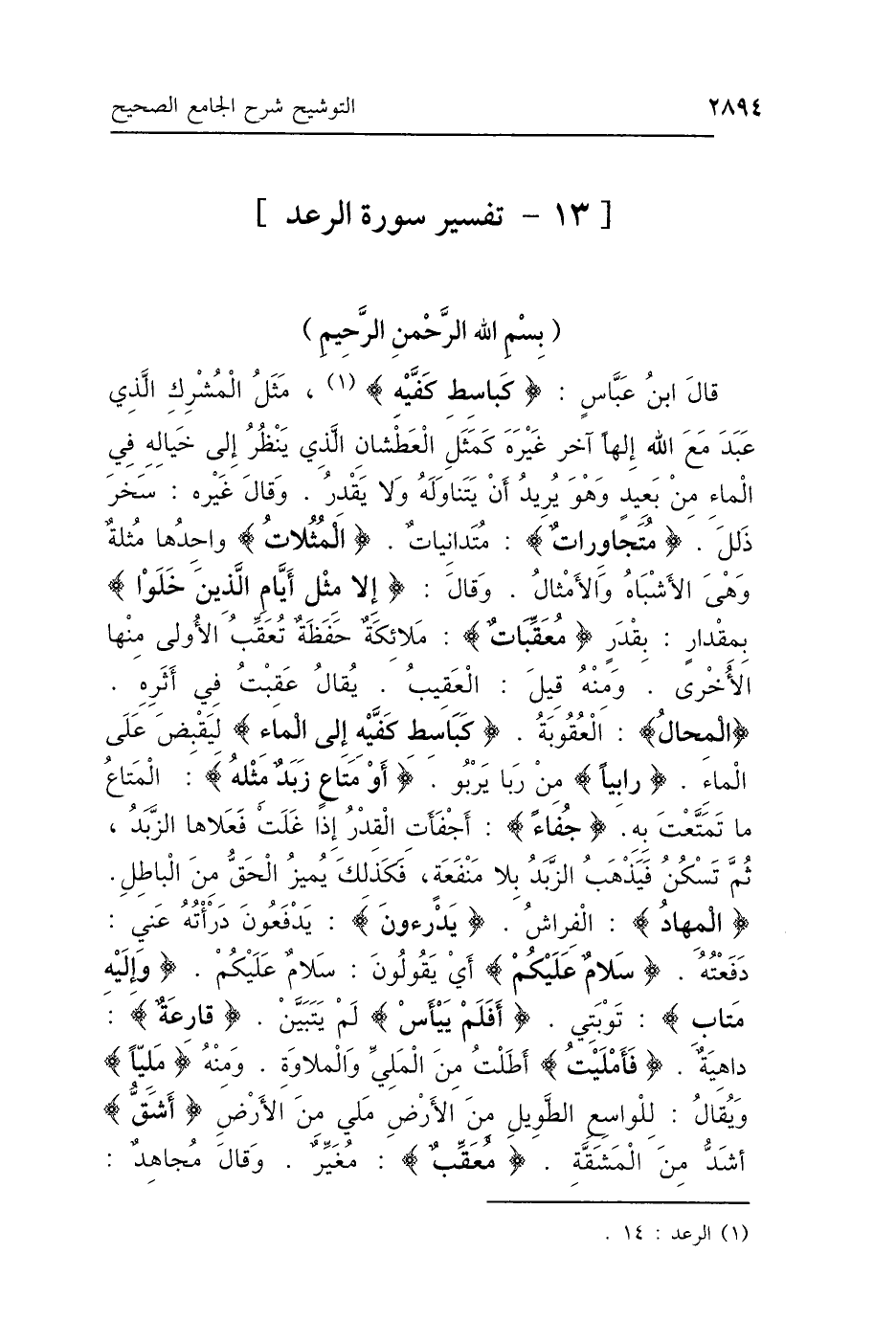 وَقَالَ ابْنُ عَبَّاسٍ: {كَبَاسِطِ كَفَّيْهِ} [الرعد: 14]: «مَثَلُ المُشْرِكِ الَّذِي عَبَدَ مَعَ اللَّهِ إِلَهًا آخَرَ غَيْرَهُ، كَمَثَلِ العَطْشَانِ الَّذِي يَنْظُرُ إِلَى ظِلِّ خَيَالِهِ فِي المَاءِ مِنْ بَعِيدٍ وَهُوَ يُرِيدُ أَنْ يَتَنَاوَلَهُ وَلاَ يَقْدِرُ» وَقَالَ غَيْرُهُ: {سَخَّرَ} [التوبة: 79]: «ذَلَّلَ»، {مُتَجَاوِرَاتٌ} [الرعد: 4]: «مُتَدَانِيَاتٌ»، وَقَالَ غَيْرُهُ: {المَثُلاَتُ} [الرعد: 6]: «وَاحِدُهَا مَثُلَةٌ، وَهِيَ الأَشْبَاهُ وَالأَمْثَالُ»، وَقَالَ: {إِلَّا مِثْلَ أَيَّامِ الَّذِينَ خَلَوْا} [يونس: 102] {بِمِقْدَارٍ} [الرعد: 8]: «بِقَدَرٍ»، يُقَالُ: {مُعَقِّبَاتٌ} [الرعد: 11]: «مَلاَئِكَةٌ حَفَظَةٌ، تُعَقِّبُ الأُولَى مِنْهَا الأُخْرَى، وَمِنْهُ قِيلَ العَقِيبُ، أَيْ عَقَّبْتُ فِي إِثْرِهِ»، {المِحَالِ} [الرعد: 13]: «العُقُوبَةُ»، {كَبَاسِطِ كَفَّيْهِ إِلَى المَاءِ} [الرعد: 14]: «لِيَقْبِضَ عَلَى المَاءِ»، {رَابِيًا} [الرعد: 17]: «مِنْ رَبَا يَرْبُو»، {أَوْ مَتَاعٍ زَبَدٌ مِثْلُهُ} [الرعد: 17]: «المَتَاعُ مَا تَمَتَّعْتَ بِهِ»، {جُفَاءً} [الرعد: 17]: «يُقَالُ أَجْفَأَتِ القِدْرُ، إِذَا غَلَتْ فَعَلاَهَا الزَّبَدُ، ثُمَّ تَسْكُنُ فَيَذْهَبُ الزَّبَدُ بِلاَ مَنْفَعَةٍ، فَكَذَلِكَ يُمَيِّزُ الحَقَّ مِنَ البَاطِلِ»، {المِهَادُ} [البقرة: 206]: «الفِرَاشُ»، {يَدْرَءُونَ}: " يَدْفَعُونَ، دَرَأْتُهُ عَنِّي: دَفَعْتُهُ ". {سَلاَمٌ عَلَيْكُمْ} [الأنعام: 54]: «أَيْ يَقُولُونَ سَلاَمٌ عَلَيْكُمْ»، {وَإِلَيْهِ مَتَابِ} [الرعد: 30]: «تَوْبَتِي»، {أَفَلَمْ يَيْئَسْ}: «أَفَلَمْ يَتَبَيَّنْ»، {قَارِعَةٌ} [الرعد: 31]: «دَاهِيَةٌ»، {فَأَمْلَيْتُ} [الرعد: 32]: «أَطَلْتُ مِنَ المَلِيِّ وَالمِلاَوَةِ، وَمِنْهُ» {مَلِيًّا} [مريم: 46]: «وَيُقَالُ لِلْوَاسِعِ الطَّوِيلِ مِنَ الأَرْضِ مَلًى مِنَ الأَرْضِ»، {أَشَقُّ} [الرعد: 34]: «أَشَدُّ مِنَ المَشَقَّةِ»، {مُعَقِّبَ} [الرعد: 41]: «مُغَيِّرٌ» وَقَالَ مُجَاهِدٌ: