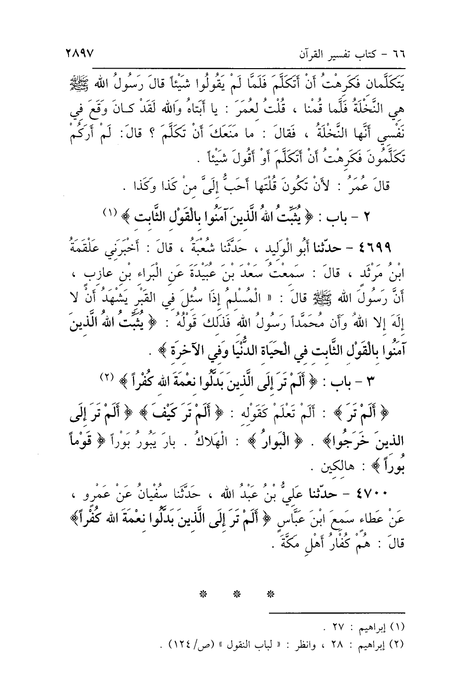 2 - بَابُ {يُثَبِّتُ اللَّهُ الَّذِينَ آمَنُوا بِالقَوْلِ الثَّابِتِ} [إبراهيم: 27]