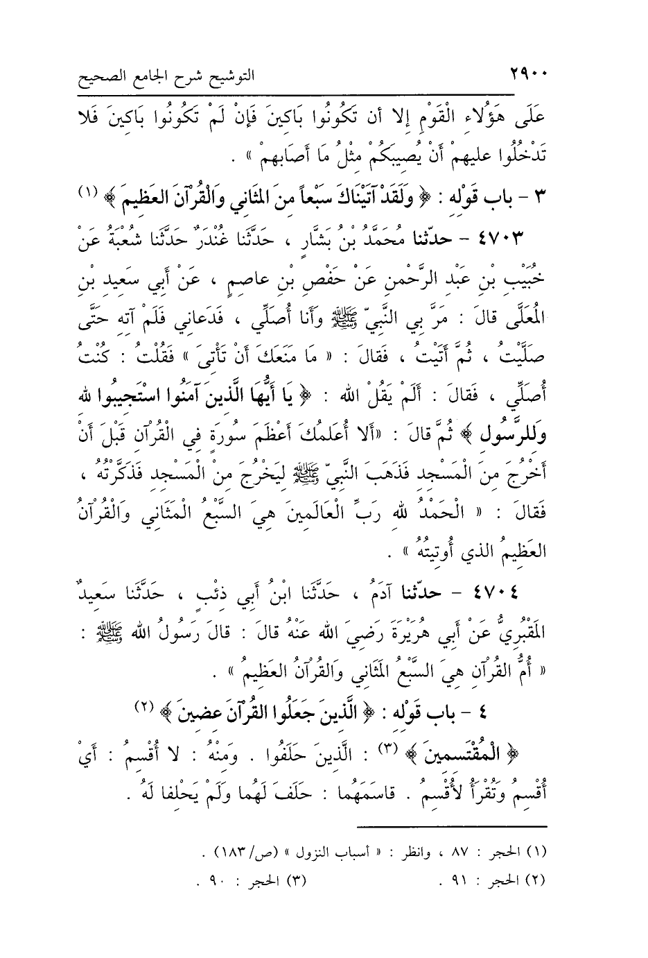 3 - بَابُ قَوْلِهِ: {وَلَقَدْ آتَيْنَاكَ سَبْعًا مِنَ المَثَانِي وَالقُرْآنَ العَظِيمَ} [الحجر: 87]
