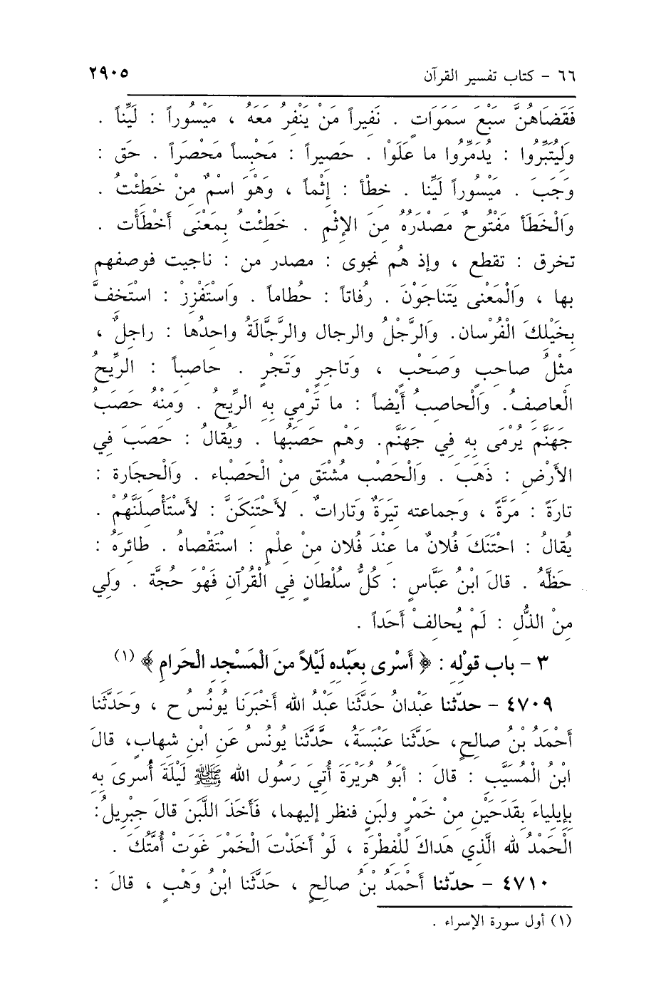 {فَقَضَاهُنَّ سَبْعَ سَمَوَاتٍ}: «خَلَقَهُنَّ»، {نَفِيرًا} [الإسراء: 6]: «مَنْ يَنْفِرُ مَعَهُ»، {وَلِيُتَبِّرُوا} [الإسراء: 7]: «يُدَمِّرُوا»، {مَا عَلَوْا} [الإسراء: 7]، {حَصِيرًا} [الإسراء: 8]: " مَحْبِسًا: مَحْصَرًا "، حَقَّ: «وَجَبَ»، {مَيْسُورًا} [الإسراء: 28]: «لَيِّنًا»، {خِطْئًا} [النساء: 92]: «إِثْمًا، وَهُوَ اسْمٌ مِنْ خَطِئْتَ، وَالخَطَأُ مَفْتُوحٌ مَصْدَرُهُ مِنَ الإِثْمِ، خَطِئْتُ بِمَعْنَى أَخْطَأْتُ تَخْرِقَ تَقْطَعَ»، {وَإِذْ هُمْ نَجْوَى} [الإسراء: 47]: " مَصْدَرٌ مِنْ نَاجَيْتُ، فَوَصَفَهُمْ بِهَا، وَالمَعْنَى: يَتَنَاجَوْنَ "، {رُفَاتًا} [الإسراء: 49]: «حُطَامًا»، {وَاسْتَفْزِزْ} [الإسراء: 64]: «اسْتَخِفَّ»، {بِخَيْلِكَ} [الإسراء: 64]: " الفُرْسَانِ، وَالرَّجْلُ: وَالرِّجَالُ، الرَّجَّالَةُ، وَاحِدُهَا رَاجِلٌ، مِثْلُ صَاحِبٍ وَصَحْبٍ، وَتَاجِرٍ وَتَجْرٍ "، {حَاصِبًا} [الإسراء: 68]: " الرِّيحُ العَاصِفُ، وَالحَاصِبُ أَيْضًا: مَا تَرْمِي بِهِ الرِّيحُ "، وَمِنْهُ: {حَصَبُ جَهَنَّمَ} [الأنبياء: 98]: " يُرْمَى بِهِ فِي جَهَنَّمَ، وَهُوَ حَصَبُهَا، وَيُقَالُ: حَصَبَ فِي الأَرْضِ ذَهَبَ، وَالحَصَبُ: مُشْتَقٌّ مِنَ الحَصْبَاءِ وَالحِجَارَةِ "، {تَارَةً} [الإسراء: 69]: «مَرَّةً، وَجَمَاعَتُهُ تِيَرَةٌ وَتَارَاتٌ»، {لَأَحْتَنِكَنَّ} [الإسراء: 62]: " لَأَسْتَأْصِلَنَّهُمْ، يُقَالُ: احْتَنَكَ فُلاَنٌ مَا عِنْدَ فُلاَنٍ مِنْ عِلْمٍ اسْتَقْصَاهُ "، {طَائِرَهُ} [الإسراء: 13]: «حَظَّهُ» قَالَ ابْنُ عَبَّاسٍ: «كُلُّ سُلْطَانٍ فِي القُرْآنِ فَهُوَ حُجَّةٌ»، {وَلِيٌّ مِنَ الذُّلِّ} [الإسراء: 111]: «لَمْ يُحَالِفْ أَحَدًا».