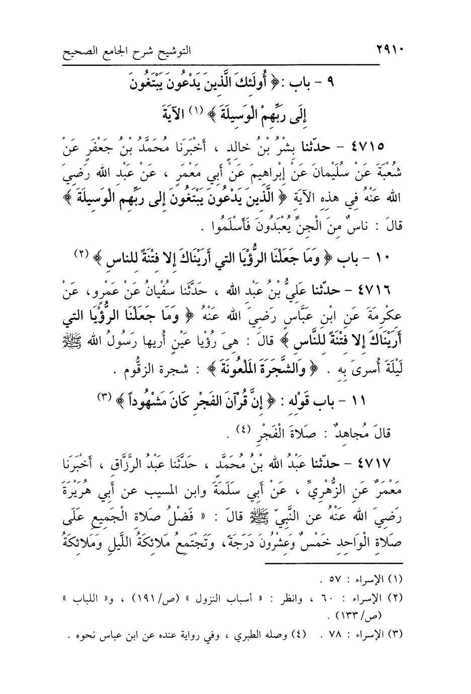 4715 - حَدَّثَنَا بِشْرُ بْنُ خَالِدٍ، أَخْبَرَنَا مُحَمَّدُ بْنُ جَعْفَرٍ، عَنْ شُعْبَةَ، عَنْ سُلَيْمَانَ، عَنْ إِبْرَاهِيمَ، عَنْ أَبِي مَعْمَرٍ، عَنْ عَبْدِ اللَّهِ رَضِيَ اللَّهُ عَنْهُ، فِي هَذِهِ الآيَةِ: {الَّذِينَ يَدْعُونَ يَبْتَغُونَ إِلَى رَبِّهِمُ الوَسِيلَةَ} [الإسراء: 57] قَالَ: «كَانَ نَاسٌ مِنَ الجِنِّ يُعْبَدُونَ فَأَسْلَمُوا».
