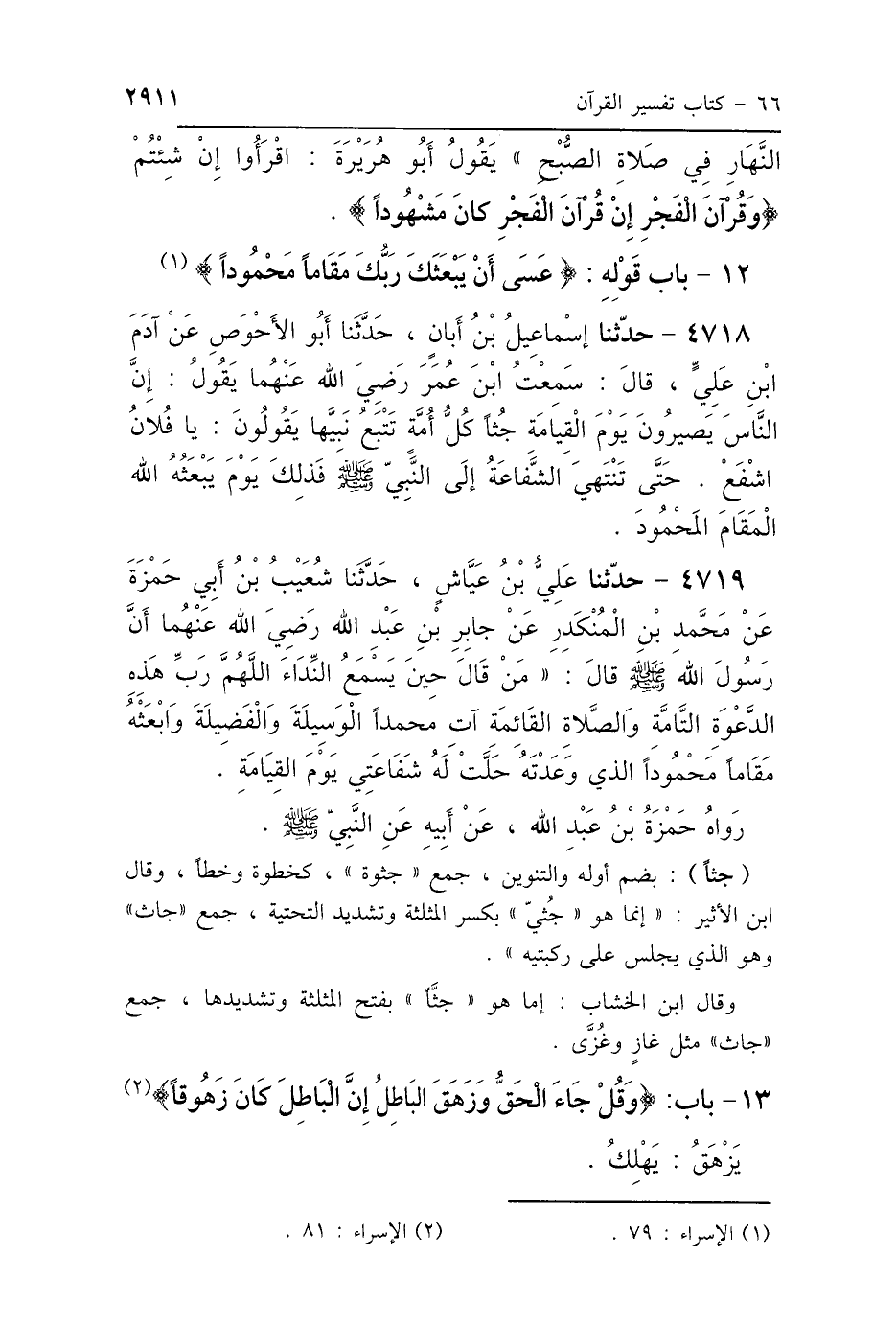4718 - حَدَّثَنِي إِسْمَاعِيلُ بْنُ أَبَانَ، حَدَّثَنَا أَبُو الأَحْوَصِ، عَنْ آدَمَ بْنِ عَلِيٍّ، قَالَ: سَمِعْتُ ابْنَ عُمَرَ رَضِيَ اللَّهُ عَنْهُمَا، يَقُولُ: " إِنَّ النَّاسَ يَصِيرُونَ يَوْمَ القِيَامَةِ جُثًا، كُلُّ أُمَّةٍ تَتْبَعُ نَبِيَّهَا يَقُولُونَ: يَا فُلاَنُ اشْفَعْ، يَا فُلاَنُ اشْفَعْ، حَتَّى تَنْتَهِيَ الشَّفَاعَةُ إِلَى النَّبِيِّ صَلَّى اللهُ عَلَيْهِ وَسَلَّمَ، فَذَلِكَ يَوْمَ يَبْعَثُهُ اللَّهُ المَقَامَ المَحْمُودَ.