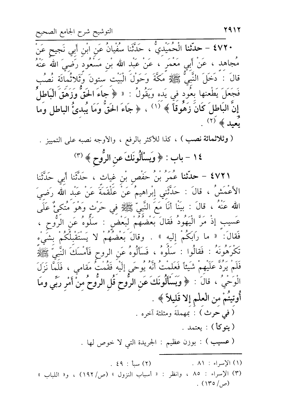 4720 - حَدَّثَنَا الحُمَيْدِيُّ، حَدَّثَنَا سُفْيَانُ، عَنِ ابْنِ أَبِي نَجِيحٍ، عَنْ مُجَاهِدٍ، عَنْ أَبِي مَعْمَرٍ، عَنْ عَبْدِ اللَّهِ بْنِ مَسْعُودٍ رَضِيَ اللَّهُ عَنْهُ، قَالَ: دَخَلَ النَّبِيُّ صَلَّى اللهُ عَلَيْهِ وَسَلَّمَ مَكَّةَ، وَحَوْلَ البَيْتِ سِتُّونَ وَثَلاَثُ مِائَةِ نُصُبٍ، فَجَعَلَ يَطْعُنُهَا بِعُودٍ فِي يَدِهِ، وَيَقُولُ: " {جَاءَ الحَقُّ وَزَهَقَ البَاطِلُ، إِنَّ البَاطِلَ كَانَ زَهُوقًا} [الإسراء: 81]، {جَاءَ الحَقُّ وَمَا يُبْدِئُ البَاطِلُ وَمَا يُعِيدُ} [سبأ: 49].