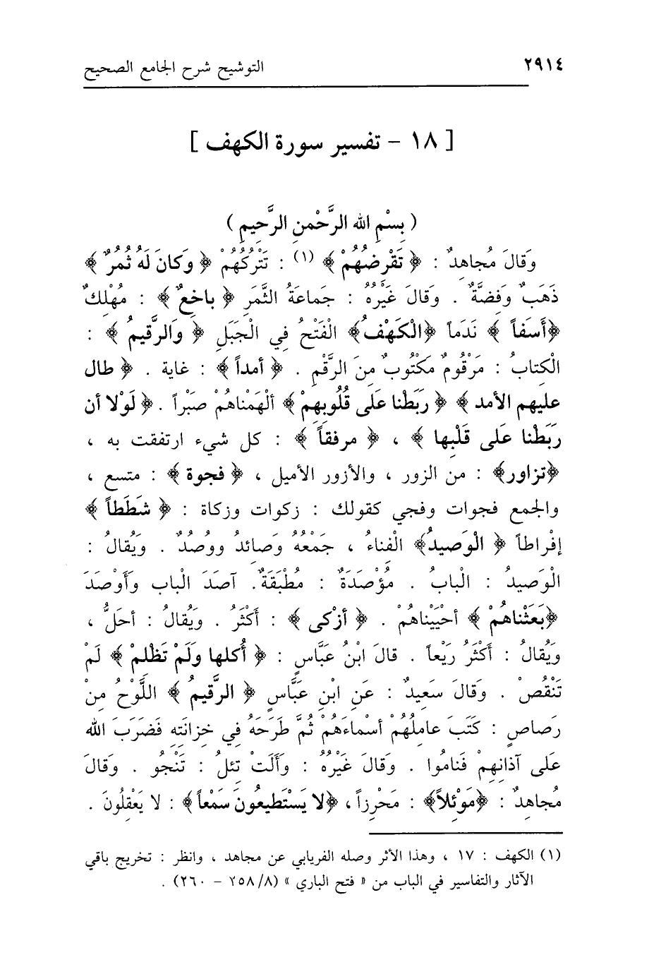 وَقَالَ مُجَاهِدٌ: {تَقْرِضُهُمْ} [الكهف: 17]: «تَتْرُكُهُمْ» (وَكَانَ لَهُ ثُمُرٌ): «ذَهَبٌ وَفِضَّةٌ» وَقَالَ غَيْرُهُ: «جَمَاعَةُ الثَّمَرِ» {بَاخِعٌ} [الكهف: 6]: «مُهْلِكٌ»، {أَسَفًا} [الأعراف: 150]: «نَدَمًا» {الكَهْفُ} [الكهف: 9]: «الفَتْحُ فِي الجَبَلِ»، وَالرَّقِيمُ: «الكِتَابُ»، {مَرْقُومٌ} [المطففين: 9]: «مَكْتُوبٌ، مِنَ الرَّقْمِ» {رَبَطْنَا عَلَى قُلُوبِهِمْ} [الكهف: 14]: «أَلْهَمْنَاهُمْ صَبْرًا»، {لَوْلاَ أَنْ رَبَطْنَا عَلَى قَلْبِهَا} [القصص: 10]، {شَطَطًا} [الكهف: 14]: «إِفْرَاطًا»، الوَصِيدُ " الفِنَاءُ، جَمْعُهُ: وَصَائِدُ وَوُصُدٌ، وَيُقَالُ الوَصِيدُ البَابُ " {مُؤْصَدَةٌ} [البلد: 20]: «مُطْبَقَةٌ، آصَدَ البَابَ وَأَوْصَدَ»، {بَعَثْنَاهُمْ} [الكهف: 12]: «أَحْيَيْنَاهُمْ»، {أَزْكَى} [البقرة: 232]: " أَكْثَرُ،، وَيُقَالُ: أَحَلُّ، وَيُقَالُ: أَكْثَرُ رَيْعًا " قَالَ ابْنُ عَبَّاسٍ: (أُكْلَهَا)، {وَلَمْ تَظْلِمْ} [الكهف: 33]: «لَمْ تَنْقُصْ» وَقَالَ سَعِيدٌ: عَنْ ابْنِ عَبَّاسٍ: {الرَّقِيمُ} [الكهف: 9]: «اللَّوْحُ مِنْ رَصَاصٍ، كَتَبَ عَامِلُهُمْ أَسْمَاءَهُمْ، ثُمَّ طَرَحَهُ فِي خِزَانَتِهِ، فَضَرَبَ اللَّهُ عَلَى آذَانِهِمْ فَنَامُوا» وَقَالَ غَيْرُهُ: " وَأَلَتْ تَئِلُ: تَنْجُو " وَقَالَ مُجَاهِدٌ: {مَوْئِلًا} [الكهف: 58]: «مَحْرِزًا»، {لاَ يَسْتَطِيعُونَ سَمْعًا} [الكهف: 101]: «لاَ يَعْقِلُونَ».