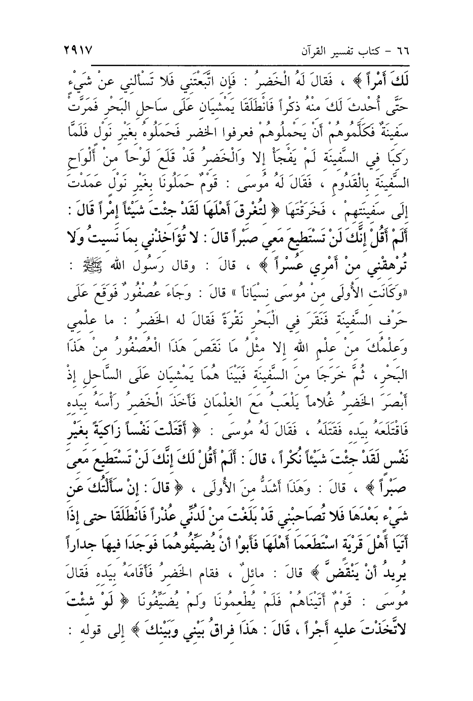 لَكَ أَمْرًا} [الكهف: 69]، فَقَالَ لَهُ الخَضِرُ: {فَإِنِ اتَّبَعْتَنِي فَلاَ تَسْأَلْنِي عَنْ شَيْءٍ حَتَّى أُحْدِثَ لَكَ مِنْهُ ذِكْرًا} [الكهف: 70]، فَانْطَلَقَا يَمْشِيَانِ عَلَى سَاحِلِ البَحْرِ فَمَرَّتْ سَفِينَةٌ فَكَلَّمُوهُمْ أَنْ يَحْمِلُوهُمْ، فَعَرَفُوا الخَضِرَ فَحَمَلُوهُمْ بِغَيْرِ نَوْلٍ، فَلَمَّا رَكِبَا فِي السَّفِينَةِ لَمْ يَفْجَأْ إِلَّا وَالخَضِرُ قَدْ قَلَعَ لَوْحًا مِنْ أَلْوَاحِ السَّفِينَةِ بِالقَدُومِ، فَقَالَ لَهُ مُوسَى: قَوْمٌ قَدْ حَمَلُونَا بِغَيْرِ نَوْلٍ عَمَدْتَ إِلَى سَفِينَتِهِمْ فَخَرَقْتَهَا (لِتُغْرِقَ أَهْلَهَا لَقَدْ جِئْتَ شَيْئًا إِمْرًا قَالَ أَلَمْ أَقُلْ إِنَّكَ لَنْ تَسْتَطِيعَ مَعِي صَبْرًا قَالَ لاَ تُؤَاخِذْنِي بِمَا نَسِيتُ وَلاَ تُرْهِقْنِي مِنْ أَمْرِي عُسْرًا) "، قَالَ: وَقَالَ رَسُولُ اللَّهِ صَلَّى اللهُ عَلَيْهِ وَسَلَّمَ: " وَكَانَتِ الأُولَى مِنْ مُوسَى نِسْيَانًا، قَالَ: وَجَاءَ عُصْفُورٌ فَوَقَعَ عَلَى حَرْفِ السَّفِينَةِ فَنَقَرَ فِي البَحْرِ نَقْرَةً، فَقَالَ لَهُ الخَضِرُ: مَا عِلْمِي وَعِلْمُكَ مِنْ عِلْمِ اللَّهِ إِلَّا مِثْلُ مَا نَقَصَ هَذَا العُصْفُورُ مِنْ هَذَا البَحْرِ، ثُمَّ خَرَجَا مِنَ السَّفِينَةِ فَبَيْنَا هُمَا يَمْشِيَانِ عَلَى السَّاحِلِ إِذْ أَبْصَرَ الخَضِرُ غُلاَمًا يَلْعَبُ مَعَ الغِلْمَانِ، فَأَخَذَ الخَضِرُ رَأْسَهُ بِيَدِهِ فَاقْتَلَعَهُ بِيَدِهِ فَقَتَلَهُ، فَقَالَ لَهُ مُوسَى: (أَقَتَلْتَ نَفْسًا زَاكِيَةً بِغَيْرِ نَفْسٍ لَقَدْ جِئْتَ شَيْئًا نُكْرًا). (قَالَ أَلَمْ أَقُلْ لَكَ إِنَّكَ لَنْ تَسْتَطِيعَ مَعِي صَبْرًا) قَالَ: وَهَذِهِ أَشَدُّ مِنَ الأُولَى، قَالَ: {إِنْ سَأَلْتُكَ عَنْ شَيْءٍ بَعْدَهَا فَلاَ تُصَاحِبْنِي، قَدْ بَلَغْتَ مِنْ لَدُنِّي عُذْرًا، فَانْطَلَقَا حَتَّى إِذَا أَتَيَا أَهْلَ قَرْيَةٍ اسْتَطْعَمَا أَهْلَهَا فَأَبَوْا أَنْ يُضَيِّفُوهُمَا، فَوَجَدَا فِيهَا جِدَارًا يُرِيدُ أَنْ يَنْقَضَّ} [الكهف: 77]- قَالَ: مَائِلٌ - فَقَامَ الخَضِرُ فَأَقَامَهُ بِيَدِهِ، فَقَالَ مُوسَى: قَوْمٌ أَتَيْنَاهُمْ فَلَمْ يُطْعِمُونَا وَلَمْ يُضَيِّفُونَا، {لَوْ شِئْتَ لاَتَّخَذْتَ عَلَيْهِ أَجْرًا} [الكهف: 77]، قَالَ: {هَذَا فِرَاقُ بَيْنِي وَبَيْنِكَ} [الكهف: 78] إِلَى قَوْلِهِ: