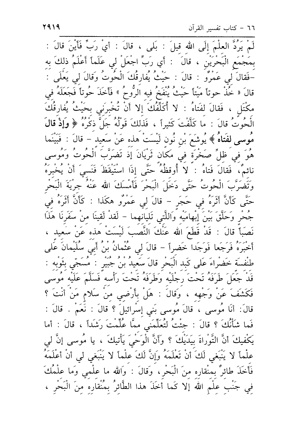 لَمْ يَرُدَّ العِلْمَ إِلَى اللَّهِ، قِيلَ: بَلَى، قَالَ: أَيْ رَبِّ، فَأَيْنَ؟ قَالَ: بِمَجْمَعِ البَحْرَيْنِ، قَالَ: أَيْ رَبِّ، اجْعَلْ لِي عَلَمًا أَعْلَمُ ذَلِكَ بِهِ - فَقَالَ لِي عَمْرٌو - قَالَ: حَيْثُ يُفَارِقُكَ الحُوتُ - وَقَالَ لِي يَعْلَى - قَالَ: خُذْ نُونًا مَيِّتًا، حَيْثُ يُنْفَخُ فِيهِ الرُّوحُ، فَأَخَذَ حُوتًا فَجَعَلَهُ فِي مِكْتَلٍ، فَقَالَ لِفَتَاهُ: لاَ أُكَلِّفُكَ إِلَّا أَنْ تُخْبِرَنِي بِحَيْثُ يُفَارِقُكَ الحُوتُ، قَالَ: مَا كَلَّفْتَ كَثِيرًا فَذَلِكَ قَوْلُهُ جَلَّ ذِكْرُهُ: {وَإِذْ قَالَ مُوسَى لِفَتَاهُ} [الكهف: 60] يُوشَعَ بْنِ نُونٍ - لَيْسَتْ عَنْ سَعِيدٍ - قَالَ: فَبَيْنَمَا هُوَ فِي ظِلِّ صَخْرَةٍ فِي مَكَانٍ ثَرْيَانَ، إِذْ تَضَرَّبَ الحُوتُ وَمُوسَى نَائِمٌ، فَقَالَ فَتَاهُ: لاَ أُوقِظُهُ حَتَّى إِذَا اسْتَيْقَظَ نَسِيَ أَنْ يُخْبِرَهُ، وَتَضَرَّبَ الحُوتُ حَتَّى دَخَلَ البَحْرَ، فَأَمْسَكَ اللَّهُ عَنْهُ جِرْيَةَ البَحْرِ، حَتَّى كَأَنَّ أَثَرَهُ فِي حَجَرٍ - قَالَ لِي عَمْرٌو: هَكَذَا كَأَنَّ أَثَرَهُ فِي حَجَرٍ، وَحَلَّقَ بَيْنَ إِبْهَامَيْهِ وَاللَّتَيْنِ تَلِيَانِهِمَا - {لَقَدْ لَقِينَا مِنْ سَفَرِنَا هَذَا نَصَبًا} [الكهف: 62]، قَالَ: قَدْ قَطَعَ اللَّهُ عَنْكَ النَّصَبَ - لَيْسَتْ هَذِهِ عَنْ سَعِيدٍ أَخْبَرَهُ - فَرَجَعَا فَوَجَدَا خَضِرًا - قَالَ لِي عُثْمَانُ بْنُ أَبِي سُلَيْمَانَ - عَلَى طِنْفِسَةٍ خَضْرَاءَ، عَلَى كَبِدِ البَحْرِ - قَالَ سَعِيدُ بْنُ جُبَيْرٍ - مُسَجًّى بِثَوْبِهِ قَدْ جَعَلَ طَرَفَهُ تَحْتَ رِجْلَيْهِ، وَطَرَفَهُ تَحْتَ رَأْسِهِ، فَسَلَّمَ عَلَيْهِ مُوسَى فَكَشَفَ عَنْ وَجْهِهِ، وَقَالَ: هَلْ بِأَرْضِي مِنْ سَلاَمٍ مَنْ أَنْتَ؟ قَالَ: أَنَا مُوسَى، قَالَ: مُوسَى بَنِي إِسْرَائِيلَ؟ قَالَ: نَعَمْ، قَالَ: فَمَا شَأْنُكَ؟ قَالَ: جِئْتُ لِتُعَلِّمَنِي مِمَّا عُلِّمْتَ رَشَدًا، قَالَ: أَمَا يَكْفِيكَ أَنَّ التَّوْرَاةَ بِيَدَيْكَ، وَأَنَّ الوَحْيَ يَأْتِيكَ يَا مُوسَى، إِنَّ لِي عِلْمًا لاَ يَنْبَغِي لَكَ أَنْ تَعْلَمَهُ، وَإِنَّ لَكَ عِلْمًا لاَ يَنْبَغِي لِي أَنْ أَعْلَمَهُ، فَأَخَذَ طَائِرٌ بِمِنْقَارِهِ مِنَ البَحْرِ، وَقَالَ: وَاللَّهِ مَا عِلْمِي وَمَا عِلْمُكَ فِي جَنْبِ عِلْمِ اللَّهِ إِلَّا كَمَا أَخَذَ هَذَا الطَّائِرُ بِمِنْقَارِهِ مِنَ البَحْرِ،