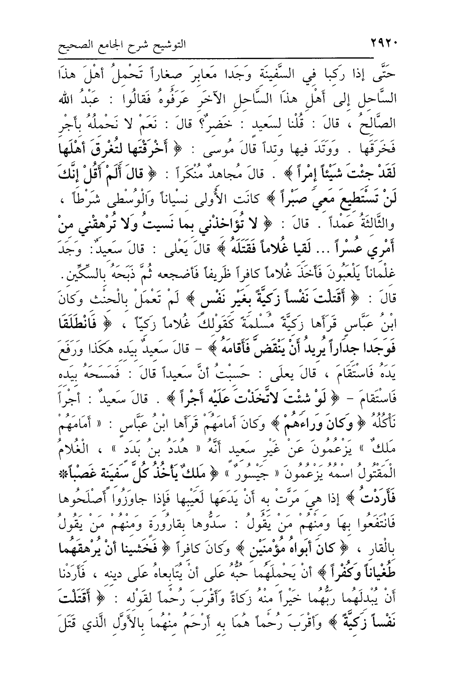 حَتَّى إِذَا رَكِبَا فِي السَّفِينَةِ وَجَدَا مَعَابِرَ صِغَارًا، تَحْمِلُ أَهْلَ هَذَا السَّاحِلِ إِلَى أَهْلِ هَذَا السَّاحِلِ الآخَرِ، عَرَفُوهُ فَقَالُوا: عَبْدُ اللَّهِ الصَّالِحُ - قَالَ: قُلْنَا لِسَعِيدٍ: خَضِرٌ؟ قَالَ: نَعَمْ - لاَ نَحْمِلُهُ بِأَجْرٍ، فَخَرَقَهَا وَوَتَدَ فِيهَا وَتِدًا، قَالَ مُوسَى: {أَخَرَقْتَهَا لِتُغْرِقَ أَهْلَهَا، لَقَدْ جِئْتَ شَيْئًا إِمْرًا} [الكهف: 71]- قَالَ مُجَاهِدٌ: مُنْكَرًا - (قَالَ أَلَمْ أَقُلْ إِنَّكَ لَنْ تَسْتَطِيعَ مَعِي صَبْرًا)، كَانَتِ الأُولَى نِسْيَانًا وَالوُسْطَى شَرْطًا، وَالثَّالِثَةُ عَمْدًا، {قَالَ: لاَ تُؤَاخِذْنِي بِمَا نَسِيتُ وَلاَ تُرْهِقْنِي مِنْ أَمْرِي عُسْرًا} [الكهف: 73]، لَقِيَا غُلاَمًا فَقَتَلَهُ - قَالَ يَعْلَى: قَالَ سَعِيدٌ: وَجَدَ غِلْمَانًا يَلْعَبُونَ فَأَخَذَ غُلاَمًا كَافِرًا ظَرِيفًا فَأَضْجَعَهُ ثُمَّ ذَبَحَهُ بِالسِّكِّينِ - {قَالَ: أَقَتَلْتَ نَفْسًا زَكِيَّةً بِغَيْرِ نَفْسٍ} [الكهف: 74] لَمْ تَعْمَلْ بِالحِنْثِ - وَكَانَ ابْنُ عَبَّاسٍ قَرَأَهَا زَكِيَّةً (زَاكِيَةً): مُسْلِمَةً كَقَوْلِكَ غُلاَمًا زَكِيًّا - فَانْطَلَقَا فَوَجَدَا جِدَارًا يُرِيدُ أَنْ يَنْقَضَّ، فَأَقَامَهُ - قَالَ سَعِيدٌ بِيَدِهِ هَكَذَا، وَرَفَعَ يَدَهُ فَاسْتَقَامَ، قَالَ يَعْلَى: حَسِبْتُ أَنَّ سَعِيدًا قَالَ: فَمَسَحَهُ بِيَدِهِ فَاسْتَقَامَ - {لَوْ شِئْتَ لاَتَّخَذْتَ عَلَيْهِ أَجْرًا} [الكهف: 77]- قَالَ سَعِيدٌ: أَجْرًا نَأْكُلُهُ - {وَكَانَ وَرَاءَهُمْ} [الكهف: 79] وَكَانَ أَمَامَهُمْ - قَرَأَهَا ابْنُ عَبَّاسٍ: أَمَامَهُمْ مَلِكٌ، يَزْعُمُونَ عَنْ غَيْرِ سَعِيدٍ أَنَّهُ هُدَدُ بْنُ بُدَدَ، وَالغُلاَمُ المَقْتُولُ اسْمُهُ يَزْعُمُونَ جَيْسُورٌ - {مَلِكٌ يَأْخُذُ كُلَّ سَفِينَةٍ غَصْبًا} [الكهف: 79]، فَأَرَدْتُ إِذَا هِيَ مَرَّتْ بِهِ أَنْ يَدَعَهَا لِعَيْبِهَا، فَإِذَا جَاوَزُوا أَصْلَحُوهَا فَانْتَفَعُوا بِهَا - وَمِنْهُمْ مَنْ يَقُولُ: سَدُّوهَا بِقَارُورَةٍ، وَمِنْهُمْ مَنْ يَقُولُ بِالقَارِ - {كَانَ أَبَوَاهُ مُؤْمِنَيْنِ} وَكَانَ كَافِرًا {فَخَشِينَا أَنْ يُرْهِقَهُمَا طُغْيَانًا، وَكُفْرًا} [الكهف: 80] أَنْ يَحْمِلَهُمَا حُبُّهُ عَلَى أَنْ يُتَابِعَاهُ عَلَى دِينِهِ، (فَأَرَدْنَا أَنْ يُبَدِّلَهُمَا رَبُّهُمَا خَيْرًا مِنْهُ زَكَاةً) لِقَوْلِهِ: {أَقَتَلْتَ نَفْسًا زَكِيَّةً} [الكهف: 74] {وَأَقْرَبَ رُحْمًا} [الكهف: 81] هُمَا بِهِ أَرْحَمُ مِنْهُمَا بِالأَوَّلِ، الَّذِي قَتَلَ