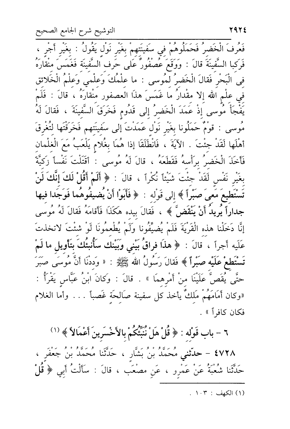فَعُرِفَ الخَضِرُ فَحَمَلُوهُمْ فِي سَفِينَتِهِمْ بِغَيْرِ نَوْلٍ - يَقُولُ بِغَيْرِ أَجْرٍ - فَرَكِبَا السَّفِينَةَ، قَالَ: وَوَقَعَ عُصْفُورٌ عَلَى حَرْفِ السَّفِينَةِ فَغَمَسَ مِنْقَارَهُ فِي البَحْرِ، فَقَالَ الخَضِرُ لِمُوسَى: مَا عِلْمُكَ وَعِلْمِي وَعِلْمُ الخَلاَئِقِ فِي عِلْمِ اللَّهِ إِلَّا مِقْدَارُ مَا غَمَسَ هَذَا العُصْفُورُ مِنْقَارَهُ، قَالَ: فَلَمْ يَفْجَأْ مُوسَى إِذْ عَمَدَ الخَضِرُ إِلَى قَدُومٍ فَخَرَقَ السَّفِينَةَ، فَقَالَ لَهُ مُوسَى: قَوْمٌ حَمَلُونَا بِغَيْرِ نَوْلٍ، عَمَدْتَ إِلَى سَفِينَتِهِمْ فَخَرَقْتَهَا لِتُغْرِقَ أَهْلَهَا {لَقَدْ جِئْتَ} [الكهف: 71] الآيَةَ، فَانْطَلَقَا إِذَا هُمَا بِغُلاَمٍ يَلْعَبُ مَعَ الغِلْمَانِ، فَأَخَذَ الخَضِرُ بِرَأْسِهِ فَقَطَعَهُ، قَالَ لَهُ مُوسَى: {أَقَتَلْتَ نَفْسًا زَكِيَّةً بِغَيْرِ نَفْسٍ، لَقَدْ جِئْتَ شَيْئًا نُكْرًا قَالَ أَلَمْ أَقُلْ لَكَ إِنَّكَ لَنْ تَسْتَطِيعَ مَعِي صَبْرًا} [الكهف: 75] إِلَى قَوْلِهِ {فَأَبَوْا أَنْ يُضَيِّفُوهُمَا فَوَجَدَا فِيهَا جِدَارًا يُرِيدُ أَنْ يَنْقَضَّ} [الكهف: 77]- فَقَالَ بِيَدِهِ: هَكَذَا - فَأَقَامَهُ، فَقَالَ لَهُ مُوسَى: إِنَّا دَخَلْنَا هَذِهِ القَرْيَةَ فَلَمْ يُضَيِّفُونَا وَلَمْ يُطْعِمُونَا، {لَوْ شِئْتَ لاَتَّخَذْتَ عَلَيْهِ أَجْرًا، قَالَ: هَذَا فِرَاقُ بَيْنِي وَبَيْنِكَ، سَأُنَبِّئُكَ بِتَأْوِيلِ مَا لَمْ تَسْتَطِعْ عَلَيْهِ صَبْرًا} [الكهف: 77]، فَقَالَ رَسُولُ اللَّهِ صَلَّى اللهُ عَلَيْهِ وَسَلَّمَ: وَدِدْنَا أَنَّ مُوسَى صَبَرَ حَتَّى يُقَصَّ عَلَيْنَا مِنْ أَمْرِهِمَا " قَالَ: وَكَانَ ابْنُ عَبَّاسٍ يَقْرَأُ: «وَكَانَ أَمَامَهُمْ مَلِكٌ يَأْخُذُ كُلَّ سَفِينَةٍ صَالِحَةٍ غَصْبًا، وَأَمَّا الغُلاَمُ فَكَانَ كَافِرًا».
