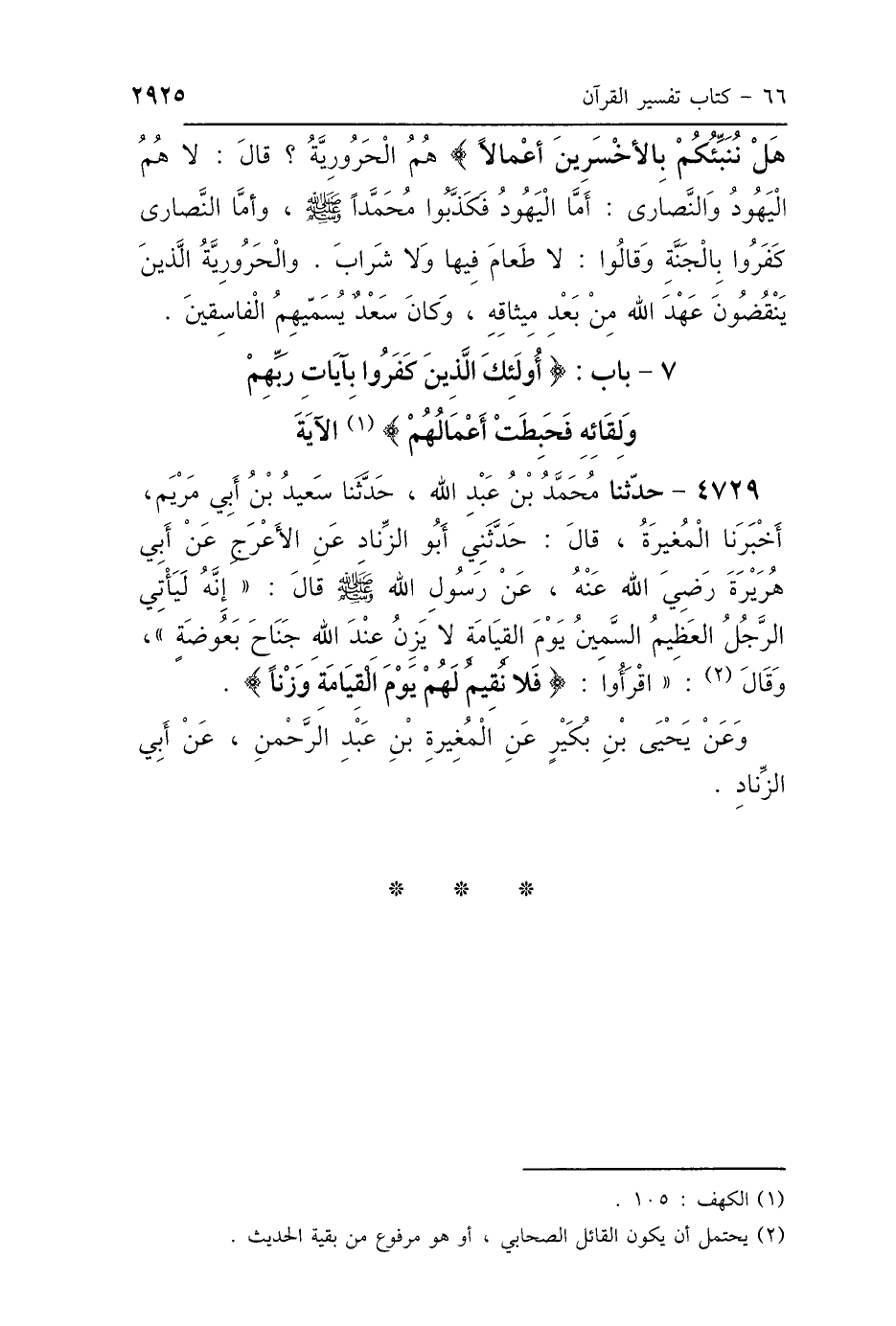 4729 - حَدَّثَنَا مُحَمَّدُ بْنُ عَبْدِ اللَّهِ، حَدَّثَنَا سَعِيدُ بْنُ أَبِي مَرْيَمَ، أَخْبَرَنَا المُغِيرَةُ بْنُ عَبْدِ الرَّحْمَنِ، قَالَ: حَدَّثَنِي أَبُو الزِّنَادِ، عَنِ الأَعْرَجِ، عَنْ أَبِي هُرَيْرَةَ رَضِيَ اللَّهُ عَنْهُ، عَنْ رَسُولِ اللَّهِ صَلَّى اللهُ عَلَيْهِ وَسَلَّمَ قَالَ: " إِنَّهُ لَيَأْتِي الرَّجُلُ العَظِيمُ السَّمِينُ يَوْمَ القِيَامَةِ، لاَ يَزِنُ عِنْدَ اللَّهِ جَنَاحَ بَعُوضَةٍ، وَقَالَ: اقْرَءُوا، {فَلاَ نُقِيمُ لَهُمْ يَوْمَ القِيَامَةِ وَزْنًا} [الكهف: 105] " وَعَنْ يَحْيَى بْنِ بُكَيْرٍ، عَنِ المُغِيرَةِ بْنِ عَبْدِ الرَّحْمَنِ، عَنْ أَبِي الزِّنَادِ مِثْلَهُ.