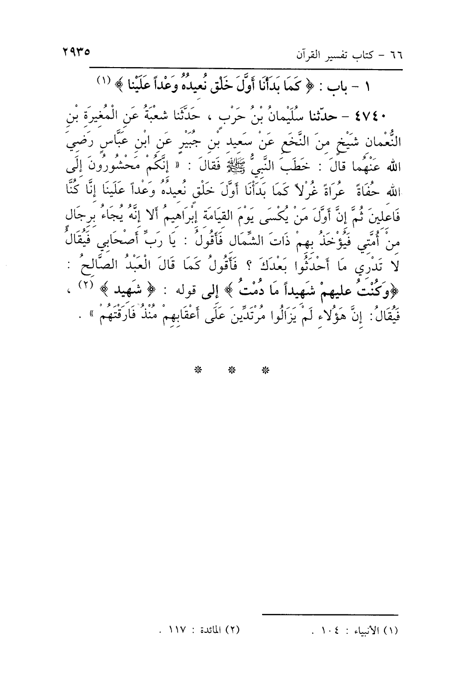 4740 - حَدَّثَنَا سُلَيْمَانُ بْنُ حَرْبٍ، حَدَّثَنَا شُعْبَةُ، عَنِ المُغِيرَةِ بْنِ النُّعْمَانِ، شَيْخٌ مِنَ النَّخَعِ، عَنْ سَعِيدِ بْنِ جُبَيْرٍ، عَنِ ابْنِ عَبَّاسٍ رَضِيَ اللَّهُ عَنْهُمَا، قَالَ: خَطَبَ النَّبِيُّ صَلَّى اللهُ عَلَيْهِ وَسَلَّمَ فَقَالَ: " إِنَّكُمْ مَحْشُورُونَ إِلَى اللَّهِ حُفَاةً عُرَاةً غُرْلًا، {كَمَا بَدَأْنَا أَوَّلَ خَلْقٍ نُعِيدُهُ، وَعْدًا عَلَيْنَا إِنَّا كُنَّا فَاعِلِينَ} [الأنبياء: 104]، ثُمَّ إِنَّ أَوَّلَ مَنْ يُكْسَى يَوْمَ القِيَامَةِ إِبْرَاهِيمُ، أَلاَ إِنَّهُ يُجَاءُ بِرِجَالٍ مِنْ أُمَّتِي، فَيُؤْخَذُ بِهِمْ ذَاتَ الشِّمَالِ، فَأَقُولُ: يَا رَبِّ أَصْحَابِي، فَيُقَالُ: لاَ تَدْرِي مَا أَحْدَثُوا بَعْدَكَ، فَأَقُولُ كَمَا قَالَ العَبْدُ الصَّالِحُ: {وَكُنْتُ عَلَيْهِمْ شَهِيدًا، مَا دُمْتُ فِيهِمْ} [المائدة: 117] إِلَى قَوْلِهِ {شَهِيدٌ} [المائدة: 117] فَيُقَالُ: إِنَّ هَؤُلاَءِ لَمْ يَزَالُوا مُرْتَدِّينَ عَلَى أَعْقَابِهِمْ مُنْذُ فَارَقْتَهُمْ.