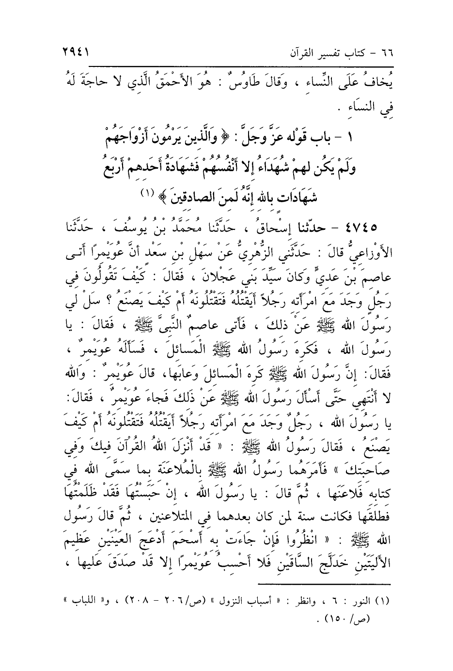 1 - بَابُ قَوْلِهِ عَزَّ وَجَلَّ: {وَالَّذِينَ يَرْمُونَ أَزْوَاجَهُمْ وَلَمْ يَكُنْ لَهُمْ شُهَدَاءُ إِلَّا أَنْفُسُهُمْ، فَشَهَادَةُ أَحَدِهِمْ أَرْبَعُ شَهَادَاتٍ بِاللَّهِ إِنَّهُ لَمِنَ الصَّادِقِينَ} [النور: 6]