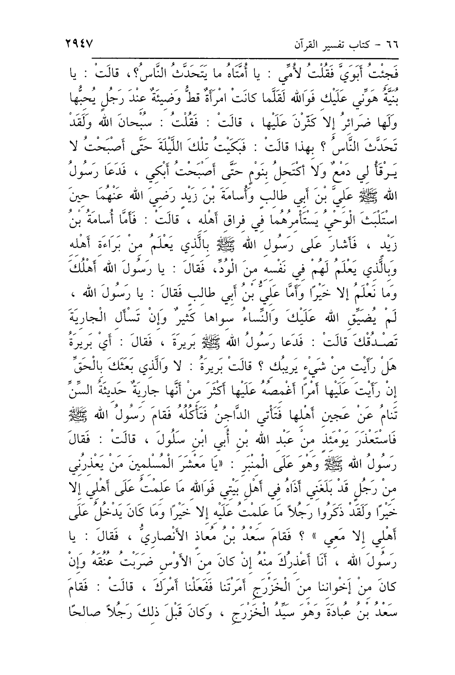 فَجِئْتُ أَبَوَيَّ فَقُلْتُ لِأُمِّي: يَا أُمَّتَاهْ مَا يَتَحَدَّثُ النَّاسُ؟ قَالَتْ: يَا بُنَيَّةُ هَوِّنِي عَلَيْكِ، فَوَاللَّهِ لَقَلَّمَا كَانَتِ امْرَأَةٌ قَطُّ وَضِيئَةٌ عِنْدَ رَجُلٍ يُحِبُّهَا، وَلَهَا ضَرَائِرُ إِلَّا كَثَّرْنَ عَلَيْهَا، قَالَتْ: فَقُلْتُ سُبْحَانَ اللَّهِ، أَوَلَقَدْ تَحَدَّثَ النَّاسُ بِهَذَا؟ قَالَتْ: فَبَكَيْتُ تِلْكَ اللَّيْلَةَ حَتَّى أَصْبَحْتُ لاَ يَرْقَأُ لِي دَمْعٌ، وَلاَ أَكْتَحِلُ بِنَوْمٍ، حَتَّى أَصْبَحْتُ أَبْكِي، فَدَعَا رَسُولُ اللَّهِ صَلَّى اللهُ عَلَيْهِ وَسَلَّمَ عَلِيَّ بْنَ أَبِي طَالِبٍ وَأُسَامَةَ بْنَ زَيْدٍ رَضِيَ اللَّهُ عَنْهُمَا حِينَ اسْتَلْبَثَ الوَحْيُ، يَسْتَأْمِرُهُمَا فِي فِرَاقِ أَهْلِهِ، قَالَتْ: فَأَمَّا أُسَامَةُ بْنُ زَيْدٍ فَأَشَارَ عَلَى رَسُولِ اللَّهِ صَلَّى اللهُ عَلَيْهِ وَسَلَّمَ بِالَّذِي يَعْلَمُ مِنْ بَرَاءَةِ أَهْلِهِ، وَبِالَّذِي يَعْلَمُ لَهُمْ فِي نَفْسِهِ مِنَ الوُدِّ، فَقَالَ: يَا رَسُولَ اللَّهِ، أَهْلَكَ وَلاَ نَعْلَمُ إِلَّا خَيْرًا، وَأَمَّا عَلِيُّ بْنُ أَبِي طَالِبٍ فَقَالَ: يَا رَسُولَ اللَّهِ لَمْ يُضَيِّقِ اللَّهُ عَلَيْكَ، وَالنِّسَاءُ سِوَاهَا كَثِيرٌ، وَإِنْ تَسْأَلِ الجَارِيَةَ تَصْدُقْكَ، قَالَتْ: فَدَعَا رَسُولُ اللَّهِ صَلَّى اللهُ عَلَيْهِ وَسَلَّمَ بَرِيرَةَ، فَقَالَ: «أَيْ بَرِيرَةُ، هَلْ رَأَيْتِ مِنْ شَيْءٍ يَرِيبُكِ؟» قَالَتْ بَرِيرَةُ: لاَ وَالَّذِي بَعَثَكَ بِالحَقِّ، إِنْ رَأَيْتُ عَلَيْهَا أَمْرًا أَغْمِصُهُ عَلَيْهَا، أَكْثَرَ مِنْ أَنَّهَا جَارِيَةٌ حَدِيثَةُ السِّنِّ، تَنَامُ عَنْ عَجِينِ أَهْلِهَا، فَتَأْتِي الدَّاجِنُ فَتَأْكُلُهُ، فَقَامَ رَسُولُ اللَّهِ صَلَّى اللهُ عَلَيْهِ وَسَلَّمَ، فَاسْتَعْذَرَ يَوْمَئِذٍ مِنْ عَبْدِ اللَّهِ بْنِ أُبَيٍّ ابْنِ سَلُولَ، قَالَتْ: فَقَالَ رَسُولُ اللَّهِ صَلَّى اللهُ عَلَيْهِ وَسَلَّمَ وَهُوَ عَلَى المِنْبَرِ: «يَا مَعْشَرَ المُسْلِمِينَ مَنْ يَعْذِرُنِي مِنْ رَجُلٍ قَدْ بَلَغَنِي أَذَاهُ فِي أَهْلِ بَيْتِي، فَوَاللَّهِ مَا عَلِمْتُ عَلَى أَهْلِي إِلَّا خَيْرًا، وَلَقَدْ ذَكَرُوا رَجُلًا مَا عَلِمْتُ عَلَيْهِ إِلَّا خَيْرًا، وَمَا كَانَ يَدْخُلُ عَلَى أَهْلِي إِلَّا مَعِي» فَقَامَ سَعْدُ بْنُ مُعَاذٍ الأَنْصَارِيُّ، فَقَالَ: يَا رَسُولَ اللَّهِ أَنَا أَعْذِرُكَ مِنْهُ، إِنْ كَانَ مِنَ الأَوْسِ ضَرَبْتُ عُنُقَهُ، وَإِنْ كَانَ مِنْ إِخْوَانِنَا مِنَ الخَزْرَجِ أَمَرْتَنَا فَفَعَلْنَا أَمْرَكَ، قَالَتْ: فَقَامَ سَعْدُ بْنُ عُبَادَةَ وَهُوَ سَيِّدُ الخَزْرَجِ، وَكَانَ قَبْلَ ذَلِكَ رَجُلًا صَالِحًا،