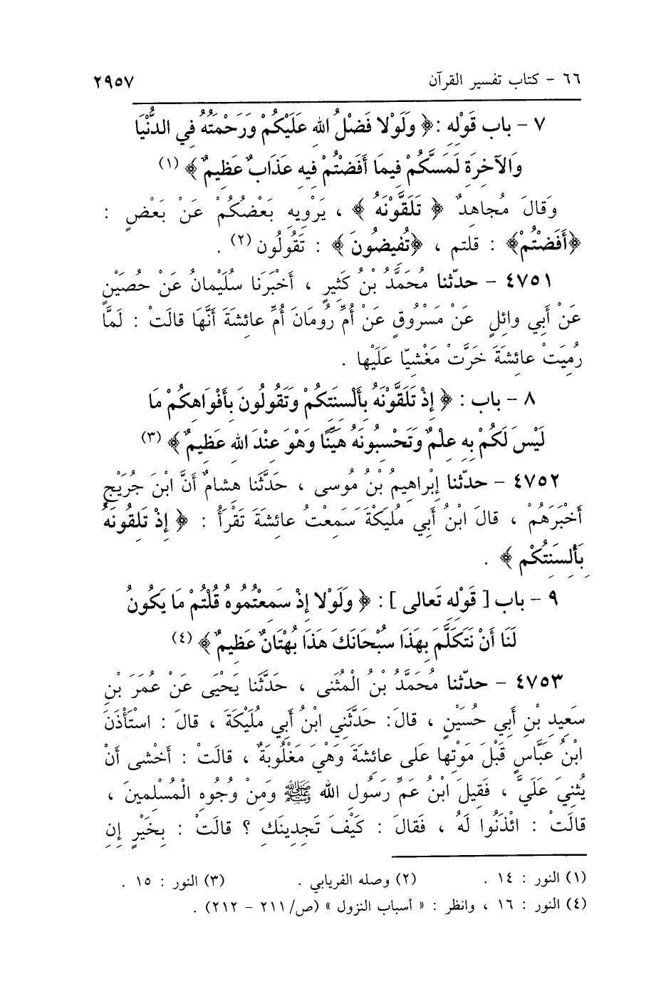 9 - بَابُ {وَلَوْلاَ إِذْ سَمِعْتُمُوهُ قُلْتُمْ مَا يَكُونُ لَنَا أَنْ نَتَكَلَّمَ بِهَذَا سُبْحَانَكَ هَذَا بُهْتَانٌ عَظِيمٌ} [النور: 16]