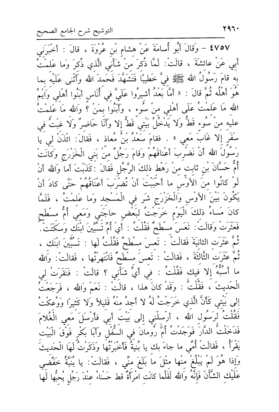 4757 - وَقَالَ أَبُو أُسَامَةَ: عَنْ هِشَامِ بْنِ عُرْوَةَ، قَالَ: أَخْبَرَنِي أَبِي، عَنْ عَائِشَةَ، قَالَتْ: لَمَّا ذُكِرَ مِنْ شَأْنِي الَّذِي ذُكِرَ، وَمَا عَلِمْتُ بِهِ قَامَ رَسُولُ اللَّهِ صَلَّى اللهُ عَلَيْهِ وَسَلَّمَ فِيَّ خَطِيبًا، فَتَشَهَّدَ فَحَمِدَ اللَّهَ وَأَثْنَى عَلَيْهِ بِمَا هُوَ أَهْلُهُ، ثُمَّ قَالَ: «أَمَّا بَعْدُ أَشِيرُوا عَلَيَّ فِي أُنَاسٍ أَبَنُوا أَهْلِي، وَايْمُ اللَّهِ مَا عَلِمْتُ عَلَى أَهْلِي مِنْ سُوءٍ، وَأَبَنُوهُمْ بِمَنْ وَاللَّهِ مَا عَلِمْتُ عَلَيْهِ مِنْ سُوءٍ قَطُّ، وَلاَ يَدْخُلُ بَيْتِي قَطُّ إِلَّا وَأَنَا حَاضِرٌ، وَلاَ غِبْتُ فِي سَفَرٍ إِلَّا غَابَ مَعِي»، فَقَامَ سَعْدُ بْنُ مُعَاذٍ فَقَالَ: ائْذَنْ لِي يَا رَسُولَ اللَّهِ أَنْ نَضْرِبَ أَعْنَاقَهُمْ، وَقَامَ رَجُلٌ مِنْ بَنِي الخَزْرَجِ، وَكَانَتْ أُمُّ حَسَّانَ بْنِ ثَابِتٍ مِنْ رَهْطِ ذَلِكَ الرَّجُلِ، فَقَالَ: كَذَبْتَ أَمَا وَاللَّهِ أَنْ لَوْ كَانُوا مِنَ الأَوْسِ مَا أَحْبَبْتَ أَنْ تُضْرَبَ أَعْنَاقُهُمْ، حَتَّى كَادَ أَنْ يَكُونَ بَيْنَ الأَوْسِ وَالخَزْرَجِ شَرٌّ فِي المَسْجِدِ، وَمَا عَلِمْتُ فَلَمَّا كَانَ مَسَاءُ ذَلِكَ اليَوْمِ، خَرَجْتُ لِبَعْضِ حَاجَتِي، وَمَعِي أُمُّ مِسْطَحٍ فَعَثَرَتْ، وَقَالَتْ: تَعِسَ مِسْطَحٌ، فَقُلْتُ: أَيْ أُمِّ تَسُبِّينَ ابْنَكِ؟ وَسَكَتَتْ ثُمَّ عَثَرَتِ الثَّانِيَةَ، فَقَالَتْ: تَعَسَ مِسْطَحٌ، فَقُلْتُ لَهَا: أَيْ أُمِّ أَتَسُبِّينَ ابْنَكِ؟ فَسَكَتَتْ ثُمَّ عَثَرَتِ الثَّالِثَةَ، فَقَالَتْ: تَعَسَ مِسْطَحٌ فَانْتَهَرْتُهَا، فَقَالَتْ: وَاللَّهِ مَا أَسُبُّهُ إِلَّا فِيكِ، فَقُلْتُ فِي أَيِّ شَأْنِي؟ قَالَتْ: فَبَقَرَتْ لِي الحَدِيثَ، فَقُلْتُ: وَقَدْ كَانَ هَذَا، قَالَتْ: نَعَمْ، وَاللَّهِ فَرَجَعْتُ إِلَى بَيْتِي كَأَنَّ الَّذِي خَرَجْتُ لَهُ لاَ أَجِدُ مِنْهُ قَلِيلًا وَلاَ كَثِيرًا، وَوُعِكْتُ، فَقُلْتُ لِرَسُولِ اللَّهِ صَلَّى اللهُ عَلَيْهِ وَسَلَّمَ: أَرْسِلْنِي إِلَى بَيْتِ أَبِي، فَأَرْسَلَ مَعِي الغُلاَمَ فَدَخَلْتُ الدَّارَ، فَوَجَدْتُ أُمَّ رُومَانَ فِي السُّفْلِ، وَأَبَا بَكْرٍ فَوْقَ البَيْتِ يَقْرَأُ، فَقَالَتْ أُمِّي: مَا جَاءَ بِكِ يَا بُنَيَّةُ؟ فَأَخْبَرْتُهَا وَذَكَرْتُ لَهَا الحَدِيثَ، وَإِذَا هُوَ لَمْ يَبْلُغْ مِنْهَا مِثْلَ مَا بَلَغَ مِنِّي، فَقَالَتْ: يَا بُنَيَّةُ، خَفِّفِي عَلَيْكِ الشَّأْنَ فَإِنَّهُ وَاللَّهِ لَقَلَّمَا كَانَتِ امْرَأَةٌ حَسْنَاءُ عِنْدَ رَجُلٍ يُحِبُّهَا لَهَا