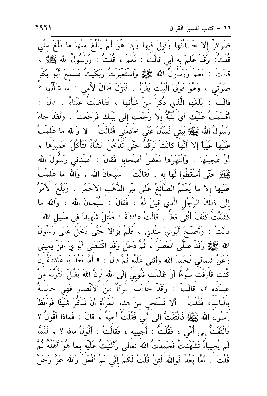 ضَرَائِرُ إِلَّا حَسَدْنَهَا، وَقِيلَ فِيهَا: وَإِذَا هُوَ لَمْ يَبْلُغْ مِنْهَا مَا بَلَغَ مِنِّي، قُلْتُ: وَقَدْ عَلِمَ بِهِ أَبِي؟ قَالَتْ: نَعَمْ، قُلْتُ: وَرَسُولُ اللَّهِ صَلَّى اللهُ عَلَيْهِ وَسَلَّمَ قَالَتْ: نَعَمْ، وَرَسُولُ اللَّهِ صَلَّى اللهُ عَلَيْهِ وَسَلَّمَ وَاسْتَعْبَرْتُ وَبَكَيْتُ، فَسَمِعَ أَبُو بَكْرٍ صَوْتِي، وَهُوَ فَوْقَ البَيْتِ يَقْرَأُ، فَنَزَلَ فَقَالَ لِأُمِّي: مَا شَأْنُهَا؟ قَالَتْ: بَلَغَهَا الَّذِي ذُكِرَ مِنْ شَأْنِهَا، فَفَاضَتْ عَيْنَاهُ، قَالَ: أَقْسَمْتُ عَلَيْكِ أَيْ بُنَيَّةُ إِلَّا رَجَعْتِ إِلَى بَيْتِكِ فَرَجَعْتُ، وَلَقَدْ جَاءَ رَسُولُ اللَّهِ صَلَّى اللهُ عَلَيْهِ وَسَلَّمَ بَيْتِي فَسَأَلَ عَنِّي خَادِمَتِي، فَقَالَتْ: لاَ وَاللَّهِ مَا عَلِمْتُ عَلَيْهَا عَيْبًا إِلَّا أَنَّهَا كَانَتْ تَرْقُدُ حَتَّى تَدْخُلَ الشَّاةُ، فَتَأْكُلَ خَمِيرَهَا - أَوْ عَجِينَهَا - وَانْتَهَرَهَا بَعْضُ أَصْحَابِهِ، فَقَالَ: اصْدُقِي رَسُولَ اللَّهِ صَلَّى اللهُ عَلَيْهِ وَسَلَّمَ حَتَّى أَسْقَطُوا لَهَا بِهِ، فَقَالَتْ: سُبْحَانَ اللَّهِ وَاللَّهِ مَا عَلِمْتُ عَلَيْهَا إِلَّا مَا يَعْلَمُ الصَّائِغُ عَلَى تِبْرِ الذَّهَبِ الأَحْمَرِ، وَبَلَغَ الأَمْرُ إِلَى ذَلِكَ الرَّجُلِ الَّذِي قِيلَ لَهُ، فَقَالَ: سُبْحَانَ اللَّهِ وَاللَّهِ مَا كَشَفْتُ كَنَفَ أُنْثَى قَطُّ، قَالَتْ عَائِشَةُ: فَقُتِلَ شَهِيدًا فِي سَبِيلِ اللَّهِ، قَالَتْ: وَأَصْبَحَ أَبَوَايَ عِنْدِي، فَلَمْ يَزَالاَ حَتَّى دَخَلَ عَلَيَّ رَسُولُ اللَّهِ صَلَّى اللهُ عَلَيْهِ وَسَلَّمَ، وَقَدْ صَلَّى العَصْرَ، ثُمَّ دَخَلَ وَقَدْ اكْتَنَفَنِي أَبَوَايَ عَنْ يَمِينِي وَعَنْ شِمَالِي، فَحَمِدَ اللَّهَ وَأَثْنَى عَلَيْهِ ثُمَّ قَالَ: «أَمَّا بَعْدُ، يَا عَائِشَةُ إِنْ كُنْتِ قَارَفْتِ سُوءًا أَوْ ظَلَمْتِ فَتُوبِي إِلَى اللَّهِ، فَإِنَّ اللَّهَ يَقْبَلُ التَّوْبَةَ مِنْ عِبَادِهِ» قَالَتْ: وَقَدْ جَاءَتِ امْرَأَةٌ مِنَ الأَنْصَارِ فَهِيَ جَالِسَةٌ بِالْبَابِ، فَقُلْتُ: أَلاَ تَسْتَحْيِ مِنْ هَذِهِ المَرْأَةِ، أَنْ تَذْكُرَ شَيْئًا، فَوَعَظَ رَسُولُ اللَّهِ صَلَّى اللهُ عَلَيْهِ وَسَلَّمَ فَالْتَفَتُّ إِلَى أَبِي، فَقُلْتُ لَهُ: أَجِبْهُ، قَالَ: فَمَاذَا أَقُولُ؟ فَالْتَفَتُّ إِلَى أُمِّي، فَقُلْتُ: أَجِيبِيهِ، فَقَالَتْ: أَقُولُ مَاذَا؟ فَلَمَّا لَمْ يُجِيبَاهُ تَشَهَّدْتُ فَحَمِدْتُ اللَّهَ وَأَثْنَيْتُ عَلَيْهِ، بِمَا هُوَ أَهْلُهُ، ثُمَّ قُلْتُ: أَمَّا بَعْدُ فَوَاللَّهِ لَئِنْ قُلْتُ لَكُمْ إِنِّي لَمْ أَفْعَلْ، وَاللَّهُ عَزَّ وَجَلَّ