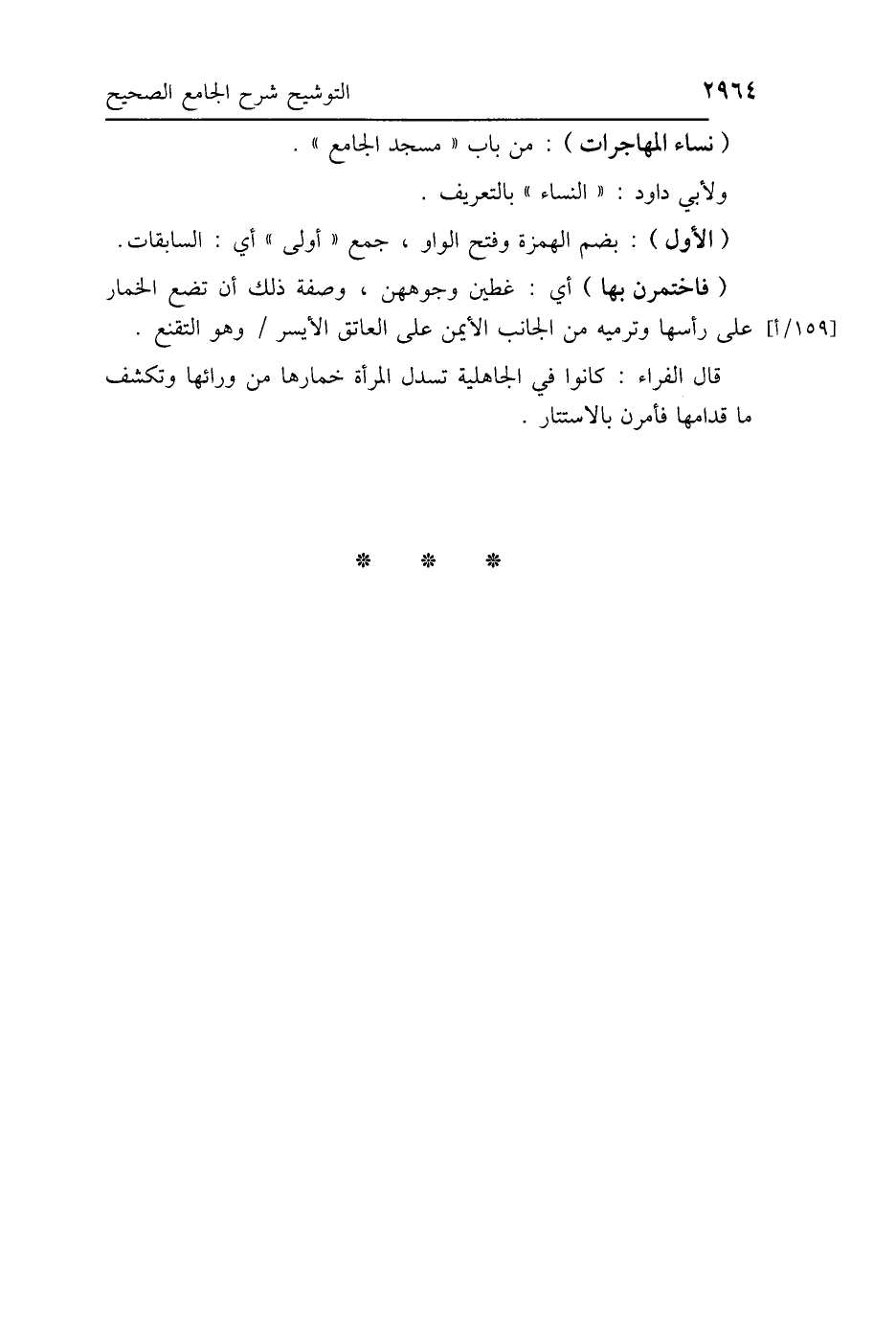 قال الفراء: كانوا في الجاهلية تسدل المرأة خمارها من ورائها وتكشف ما قدامها فأمرن بالاستتار.