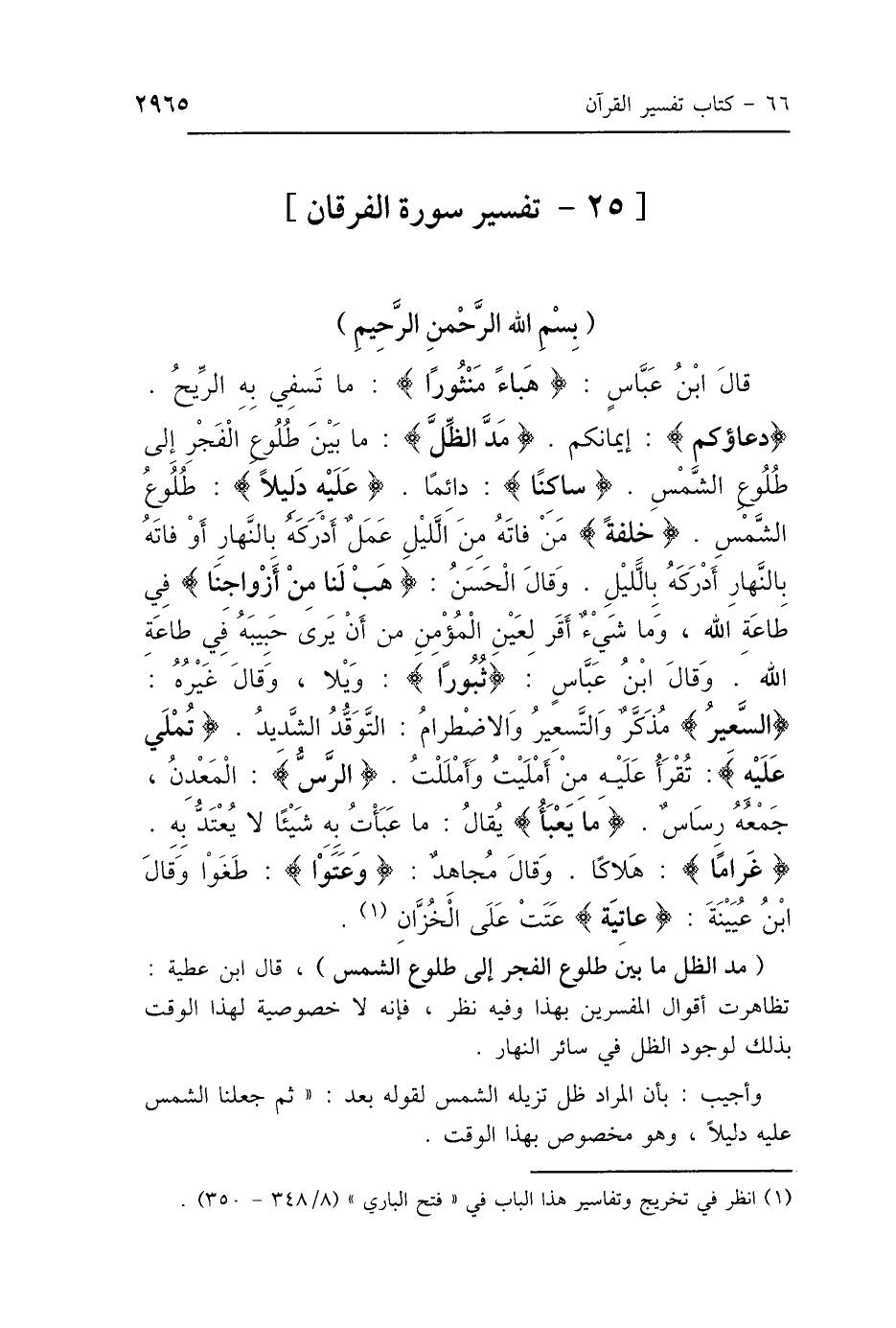 وَقَالَ ابْنُ عَبَّاسٍ: {هَبَاءً مَنْثُورًا} [الفرقان: 23]: «مَا تَسْفِي بِهِ الرِّيحُ»، {مَدَّ الظِّلَّ} [الفرقان: 45]: «مَا بَيْنَ طُلُوعِ الفَجْرِ إِلَى طُلُوعِ الشَّمْسِ»، {سَاكِنًا} [الفرقان: 45]: «دَائِمًا»، {عَلَيْهِ دَلِيلًا} [الفرقان: 45]: «طُلُوعُ الشَّمْسِ»، {خِلْفَةً} [الفرقان: 62]: «مَنْ فَاتَهُ مِنَ اللَّيْلِ عَمَلٌ أَدْرَكَهُ بِالنَّهَارِ، أَوْ فَاتَهُ بِالنَّهَارِ أَدْرَكَهُ بِاللَّيْلِ» وَقَالَ الحَسَنُ: {هَبْ لَنَا مِنْ أَزْوَاجِنَا وَذُرِّيَّاتِنَا قُرَّةَ أَعْيُنٍ} [الفرقان: 74]: «فِي طَاعَةِ اللَّهِ وَمَا شَيْءٌ أَقَرَّ لِعَيْنِ المُؤْمِنِ مِنْ أَنْ يَرَى حَبِيبَهُ فِي طَاعَةِ اللَّهِ» وَقَالَ ابْنُ عَبَّاسٍ: {ثُبُورًا} [الفرقان: 13]: وَيْلًا وَقَالَ غَيْرُهُ: السَّعِيرُ مُذَكَّرٌ، وَالتَّسَعُّرُ وَالاِضْطِرَامُ التَّوَقُّدُ الشَّدِيدُ، {تُمْلَى عَلَيْهِ} [الفرقان: 5]: " تُقْرَأُ عَلَيْهِ، مِنْ أَمْلَيْتُ وَأَمْلَلْتُ، {الرَّسُّ} [الفرقان: 38]: المَعْدِنُ، جَمْعُهُ رِسَاسٌ " {مَا يَعْبَأُ} [الفرقان: 77]: " يُقَالُ: مَا عَبَأْتُ بِهِ شَيْئًا لاَ يُعْتَدُّ بِهِ "، {غَرَامًا} [الفرقان: 65]: هَلاَكًا وَقَالَ مُجَاهِدٌ: {وَعَتَوْا} [الأعراف: 77]: طَغَوْا وَقَالَ ابْنُ عُيَيْنَةَ: {عَاتِيَةٍ} [الحاقة: 6]: «عَتَتْ عَنِ الْخُزَّانِ».