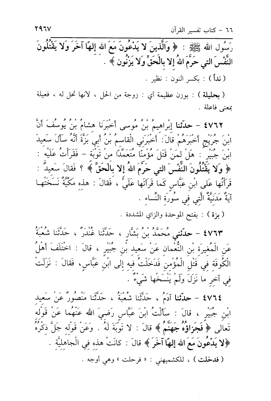 4762 - حَدَّثَنَا إِبْرَاهِيمُ بْنُ مُوسَى، أَخْبَرَنَا هِشَامُ بْنُ يُوسُفَ، أَنَّ ابْنَ جُرَيْجٍ أَخْبَرَهُمْ، قَالَ: أَخْبَرَنِي القَاسِمُ بْنُ أَبِي بَزَّةَ، أَنَّهُ سَأَلَ سَعِيدَ بْنَ جُبَيْرٍ: هَلْ لِمَنْ قَتَلَ مُؤْمِنًا مُتَعَمِّدًا مِنْ تَوْبَةٍ؟ فَقَرَأْتُ عَلَيْهِ: {وَلاَ يَقْتُلُونَ النَّفْسَ الَّتِي حَرَّمَ اللَّهُ إِلَّا بِالحَقِّ} [الفرقان: 68] فَقَالَ سَعِيدٌ: قَرَأْتُهَا عَلَى ابْنِ عَبَّاسٍ كَمَا قَرَأْتَهَا عَلَيَّ، فَقَالَ: «هَذِهِ مَكِّيَّةٌ نَسَخَتْهَا آيَةٌ مَدَنِيَّةٌ الَّتِي فِي سُورَةِ النِّسَاءِ».