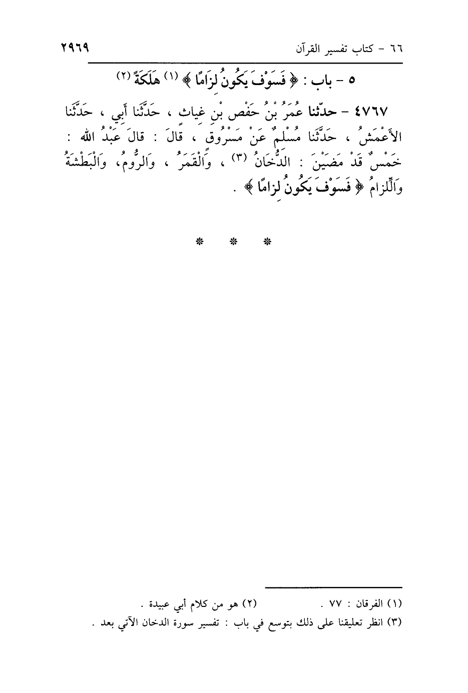 5 - بَابُ {فَسَوْفَ يَكُونُ لِزَامًا} [الفرقان: 77] أَيْ هَلَكَةً
