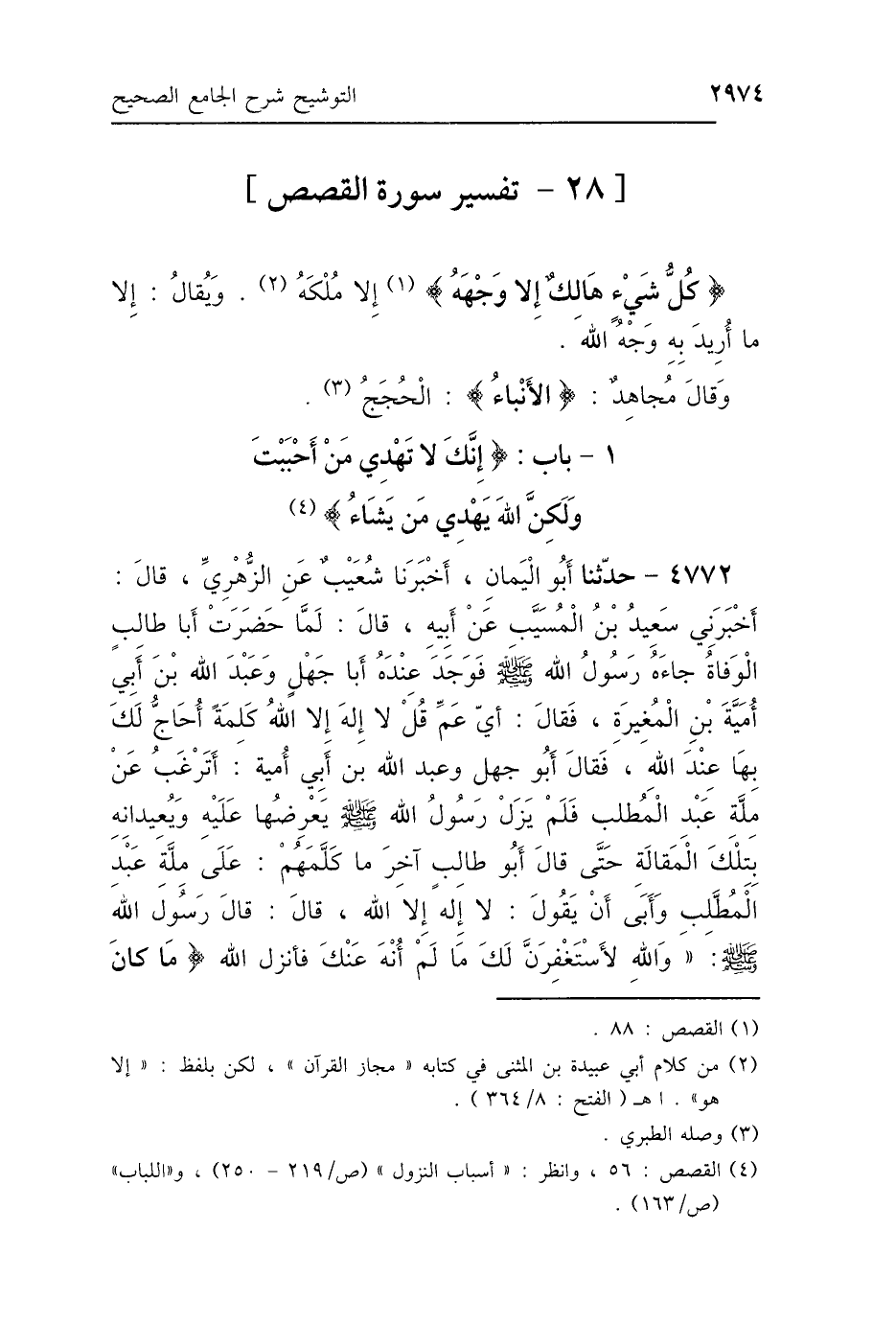 {كُلُّ شَيْءٍ هَالِكٌ إِلَّا وَجْهَهُ} [القصص: 88]: " إِلَّا مُلْكَهُ، وَيُقَالُ: إِلَّا مَا أُرِيدَ بِهِ وَجْهُ اللَّهِ " وَقَالَ مُجَاهِدٌ: " فَعَمِيَتْ عَلَيْهِمْ {الأَنْبَاءُ} [القصص: 66]: الحُجَجُ".