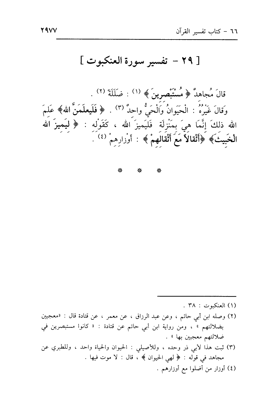 قَالَ مُجَاهِدٌ: {وَكَانُوا مُسْتَبْصِرِينَ} [العنكبوت: 38]: «ضَلَلَةً» وَقَالَ غَيْرُهُ: {الحَيَوَانُ} [العنكبوت: 64]: «وَالحَيُّ وَاحِدٌ» {فَلَيَعْلَمَنَّ اللَّهُ} [العنكبوت: 3]: «عَلِمَ اللَّهُ ذَلِكَ، إِنَّمَا هِيَ بِمَنْزِلَةِ فَلِيَمِيزَ اللَّهُ»، كَقَوْلِهِ: {لِيَمِيزَ اللَّهُ الخَبِيثَ مِنَ الطَّيِّبِ} [الأنفال: 37]، {أَثْقَالًا مَعَ أَثْقَالِهِمْ} [العنكبوت: 13]: «أَوْزَارًا مَعَ أَوْزَارِهِمْ».