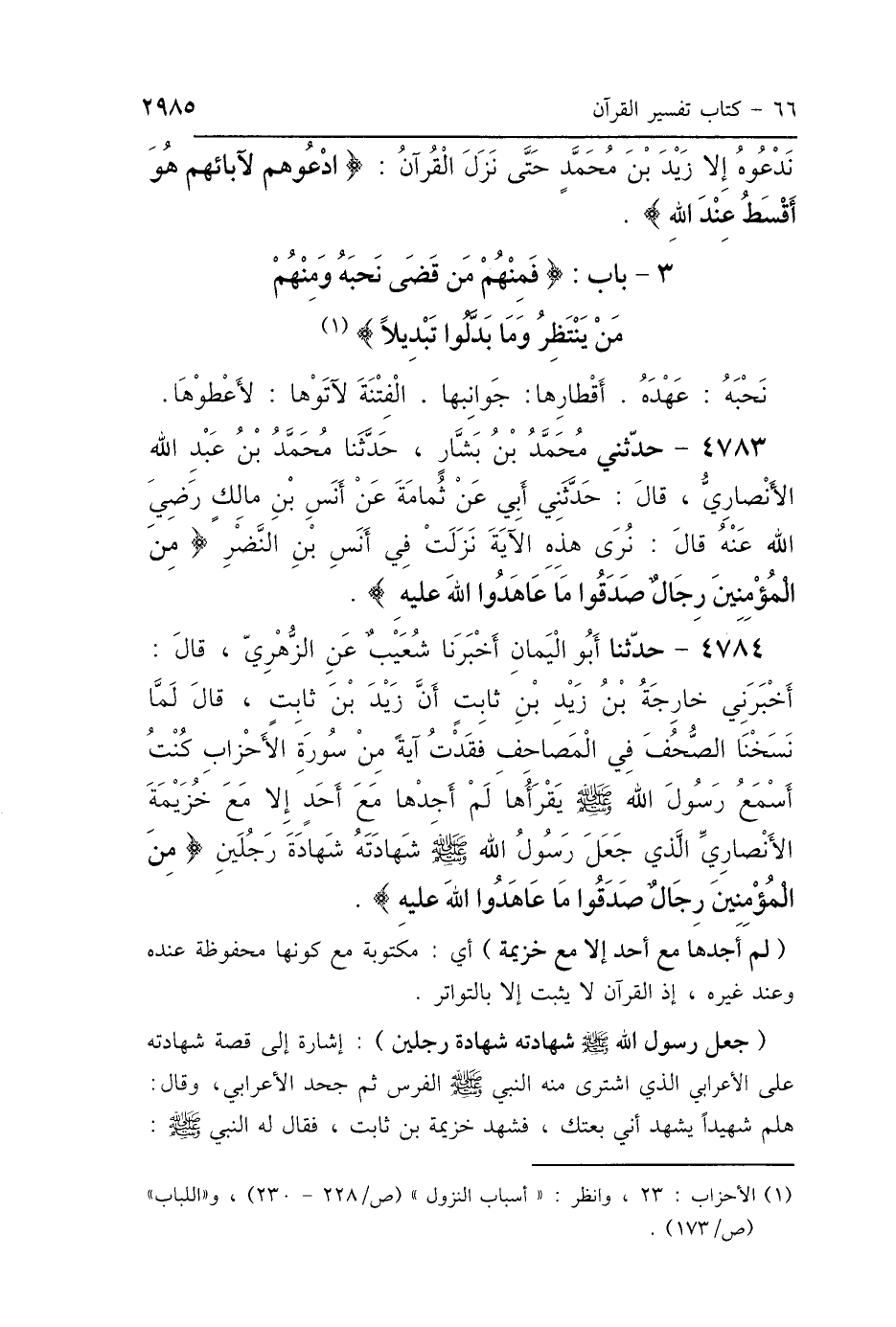 4784 - حَدَّثَنَا أَبُو اليَمَانِ، أَخْبَرَنَا شُعَيْبٌ، عَنِ الزُّهْرِيِّ، قَالَ: أَخْبَرَنِي خَارِجَةُ بْنُ زَيْدِ بْنِ ثَابِتٍ، أَنَّ زَيْدَ بْنَ ثَابِتٍ، قَالَ: «لَمَّا نَسَخْنَا الصُّحُفَ فِي المَصَاحِفِ فَقَدْتُ آيَةً مِنْ سُورَةِ الأَحْزَابِ، كُنْتُ كَثِيرًا أَسْمَعُ رَسُولَ اللَّهِ صَلَّى اللهُ عَلَيْهِ وَسَلَّمَ يَقْرَؤُهَا لَمْ أَجِدْهَا مَعَ أَحَدٍ، إِلَّا مَعَ خُزَيْمَةَ الأَنْصَارِيِّ الَّذِي جَعَلَ رَسُولُ اللَّهِ صَلَّى اللهُ عَلَيْهِ وَسَلَّمَ شَهَادَتَهُ شَهَادَةَ رَجُلَيْنِ»: {مِنَ المُؤْمِنِينَ رِجَالٌ صَدَقُوا مَا عَاهَدُوا اللَّهَ عَلَيْهِ} [الأحزاب: 23].