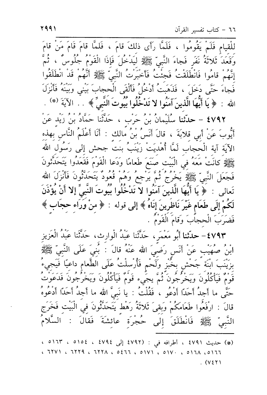 4792 - حَدَّثَنَا سُلَيْمَانُ بْنُ حَرْبٍ، حَدَّثَنَا حَمَّادُ بْنُ زَيْدٍ، عَنْ أَيُّوبَ، عَنْ أَبِي قِلاَبَةَ، قَالَ أَنَسُ بْنُ مَالِكٍ: أَنَا أَعْلَمُ النَّاسِ بِهَذِهِ الآيَةِ: آيَةِ الحِجَابِ " لَمَّا أُهْدِيَتْ زَيْنَبُ بِنْتُ جَحْشٍ رَضِيَ اللَّهُ عَنْهَا إِلَى رَسُولِ اللَّهِ صَلَّى اللهُ عَلَيْهِ وَسَلَّمَ، كَانَتْ مَعَهُ فِي البَيْتِ صَنَعَ طَعَامًا وَدَعَا القَوْمَ، فَقَعَدُوا يَتَحَدَّثُونَ، فَجَعَلَ النَّبِيُّ صَلَّى اللهُ عَلَيْهِ وَسَلَّمَ يَخْرُجُ ثُمَّ يَرْجِعُ، وَهُمْ قُعُودٌ يَتَحَدَّثُونَ، فَأَنْزَلَ اللَّهُ تَعَالَى: {يَا أَيُّهَا الَّذِينَ آمَنُوا لاَ تَدْخُلُوا بُيُوتَ النَّبِيِّ إِلَّا أَنْ يُؤْذَنَ لَكُمْ إِلَى طَعَامٍ غَيْرَ نَاظِرِينَ إِنَاهُ} [الأحزاب: 53] إِلَى قَوْلِهِ {مِنْ وَرَاءِ حِجَابٍ} [الأحزاب: 53] فَضُرِبَ الحِجَابُ وَقَامَ القَوْمُ.